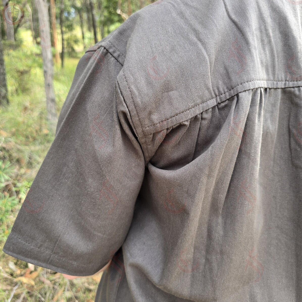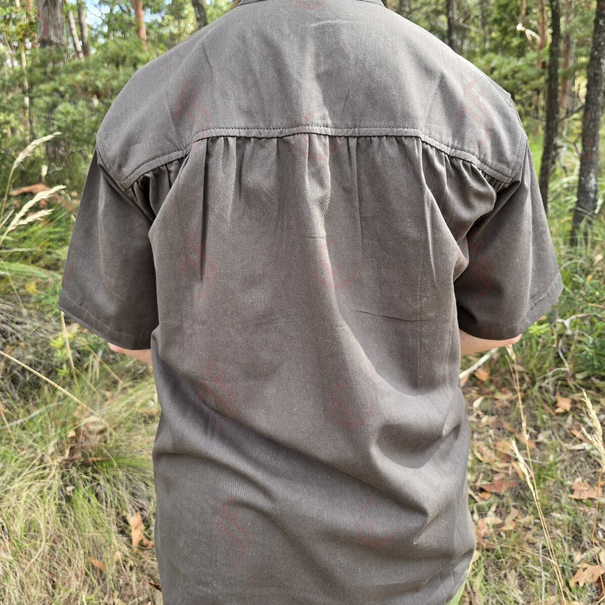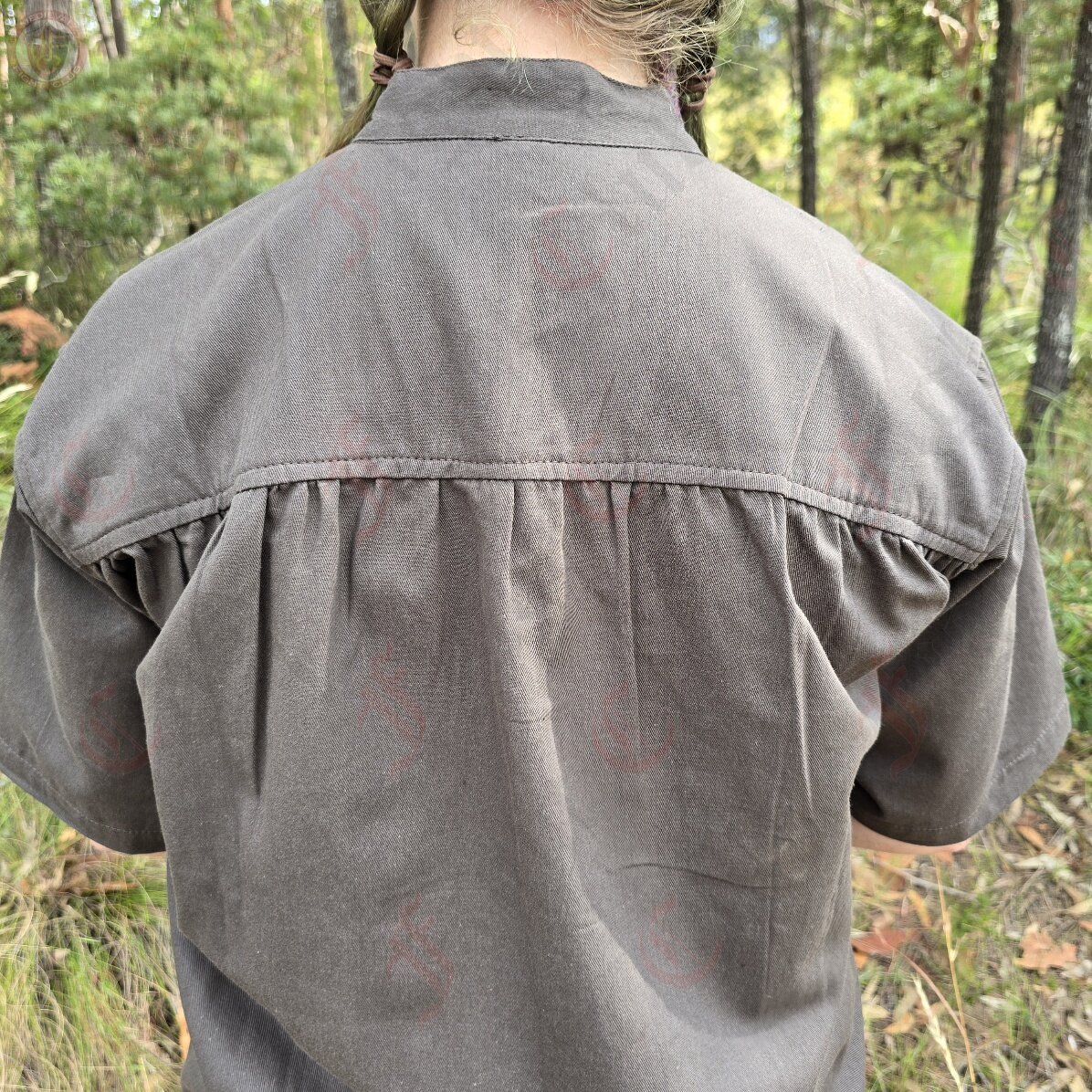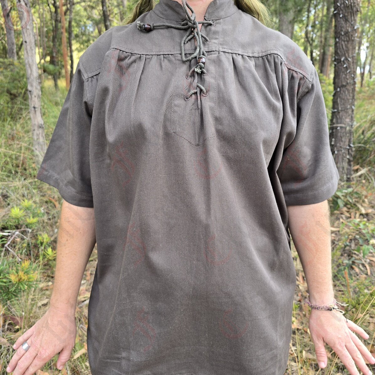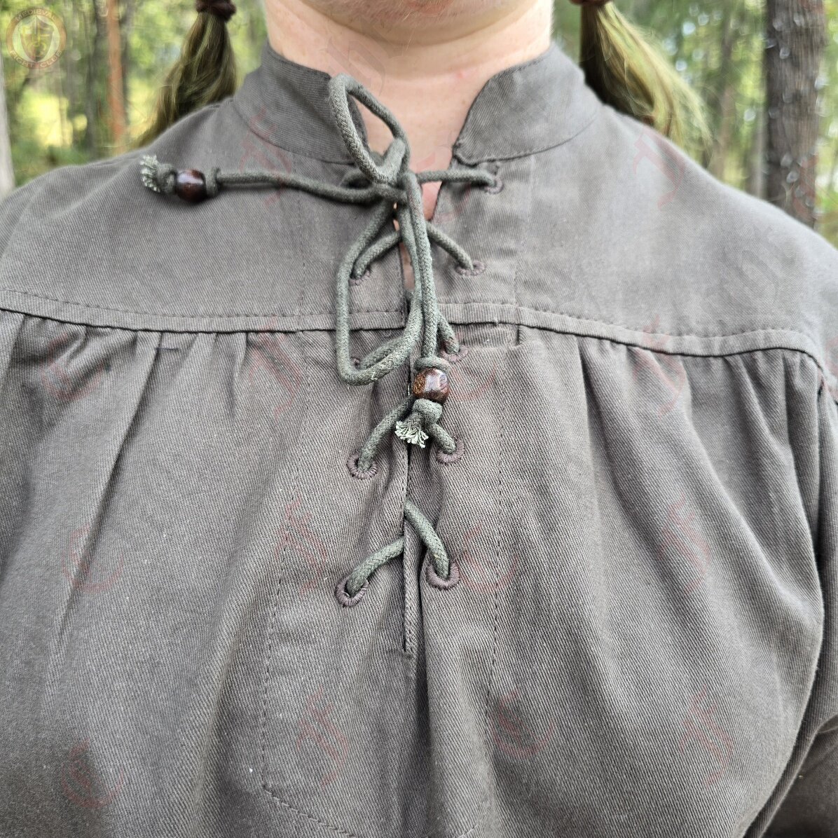 This late medieval shirt is crafted in a muted olive green, giving it an earthy, practical character typical of the period. It features short sleeves that allow for ease of movement and comfort, making it suitable for everyday wear or to work in. The front is finished with simple lacing, which can be tightened or loosened to adjust the fit. With its straightforward cut and single solid colour, the shirt is straightforward and suitable for mid to late medieval European costuming.