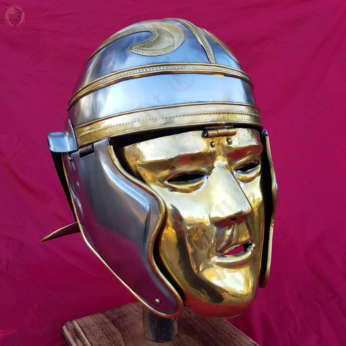 This Roman Cavalry helmet is of the standard Gallic type. Primarily made of steel with brass accents, it features the addition of a solid brass "Kalkriese" face mask hinged at the forehead, and cheek plates that fully cover the ears. The mask fits neatly beneath cheek guards.