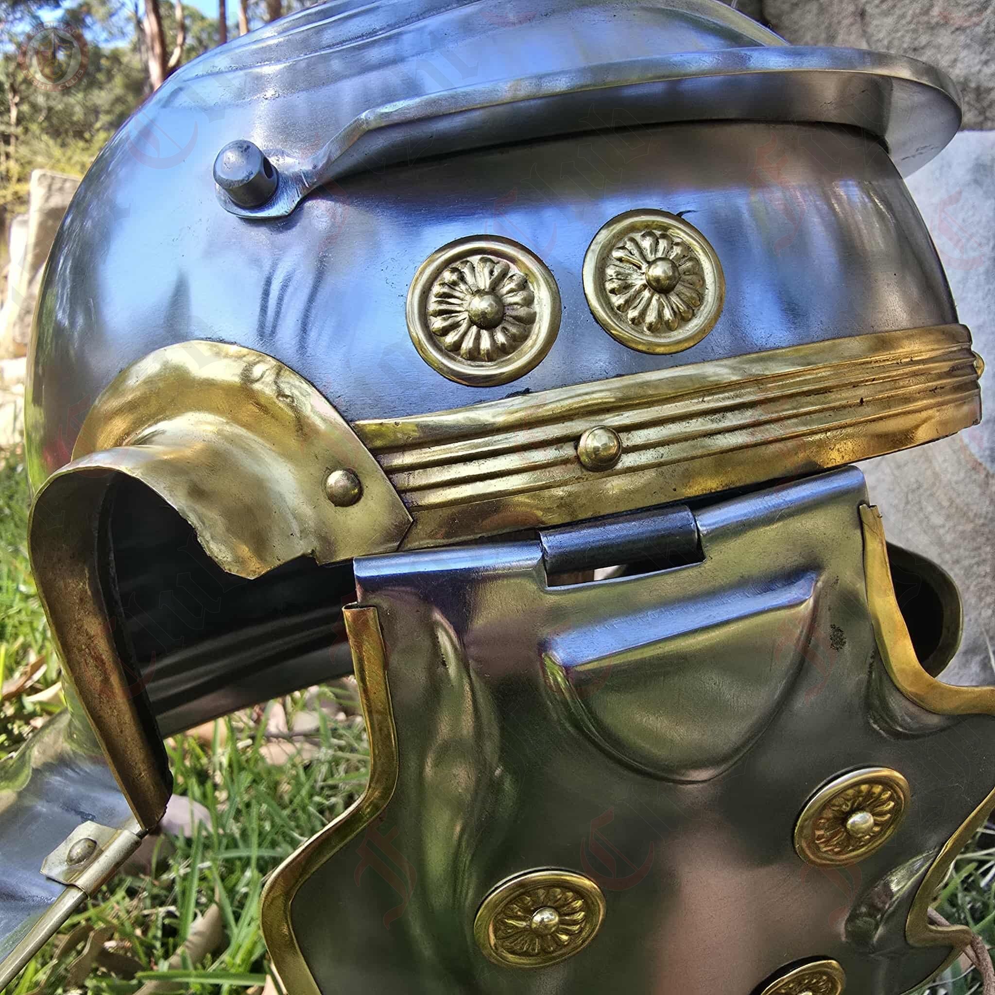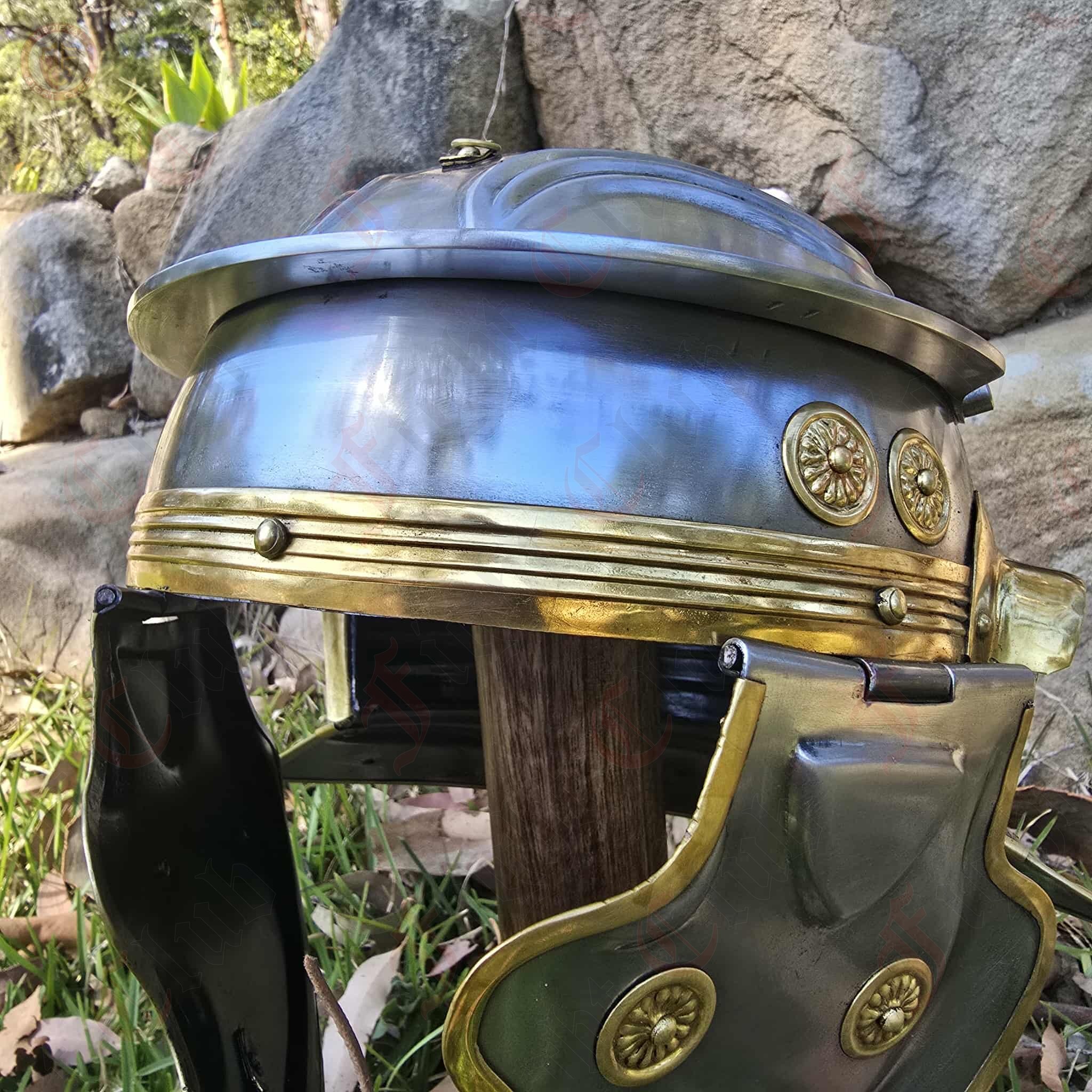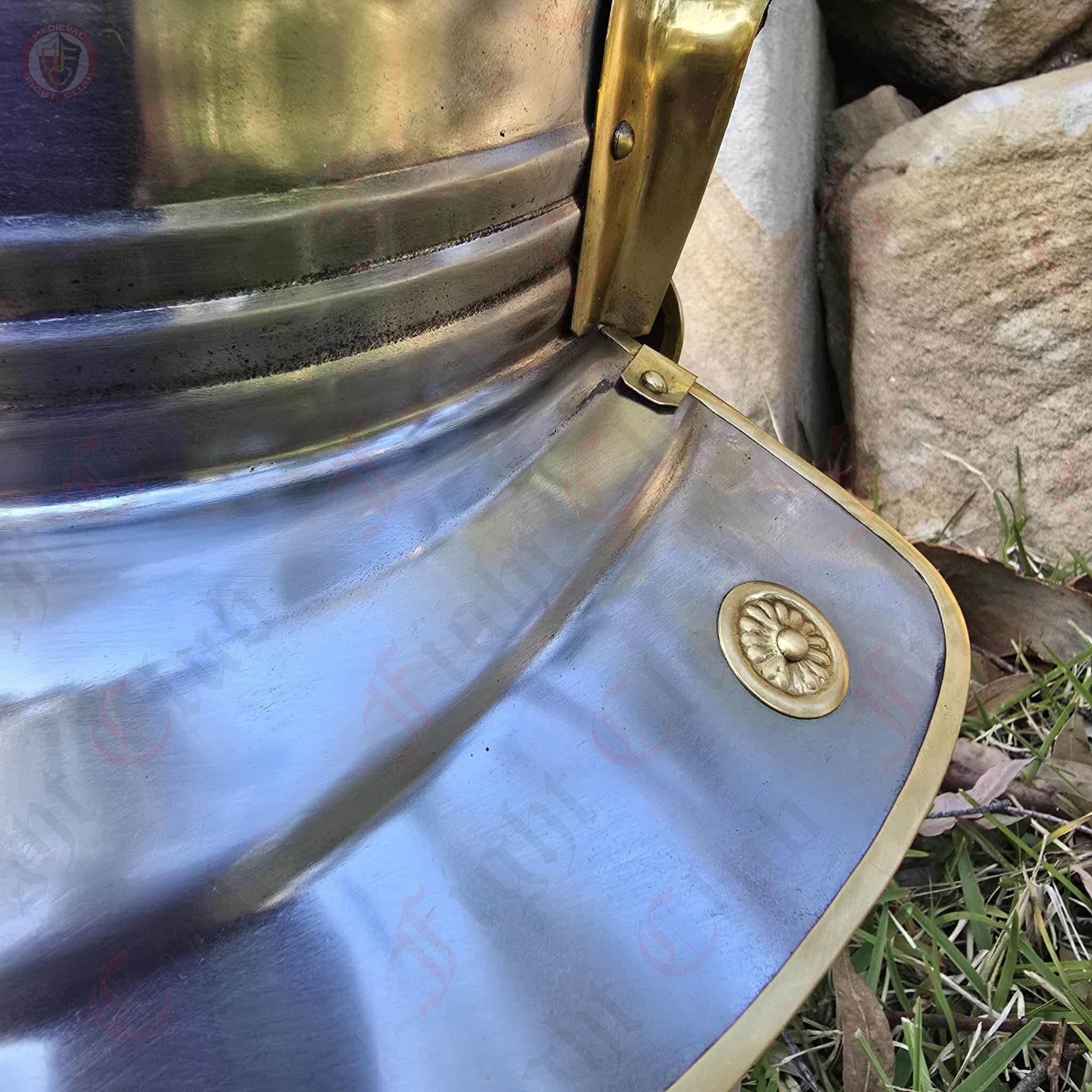 Made from durable 18-gauge steel with brass accents, it features the classic raised eyebrows, reinforced brow band and protective neck guard that defined Roman craftsmanship. The open-faced design offers excellent visibility while still providing solid coverage to the cheeks, sides and back of the head.