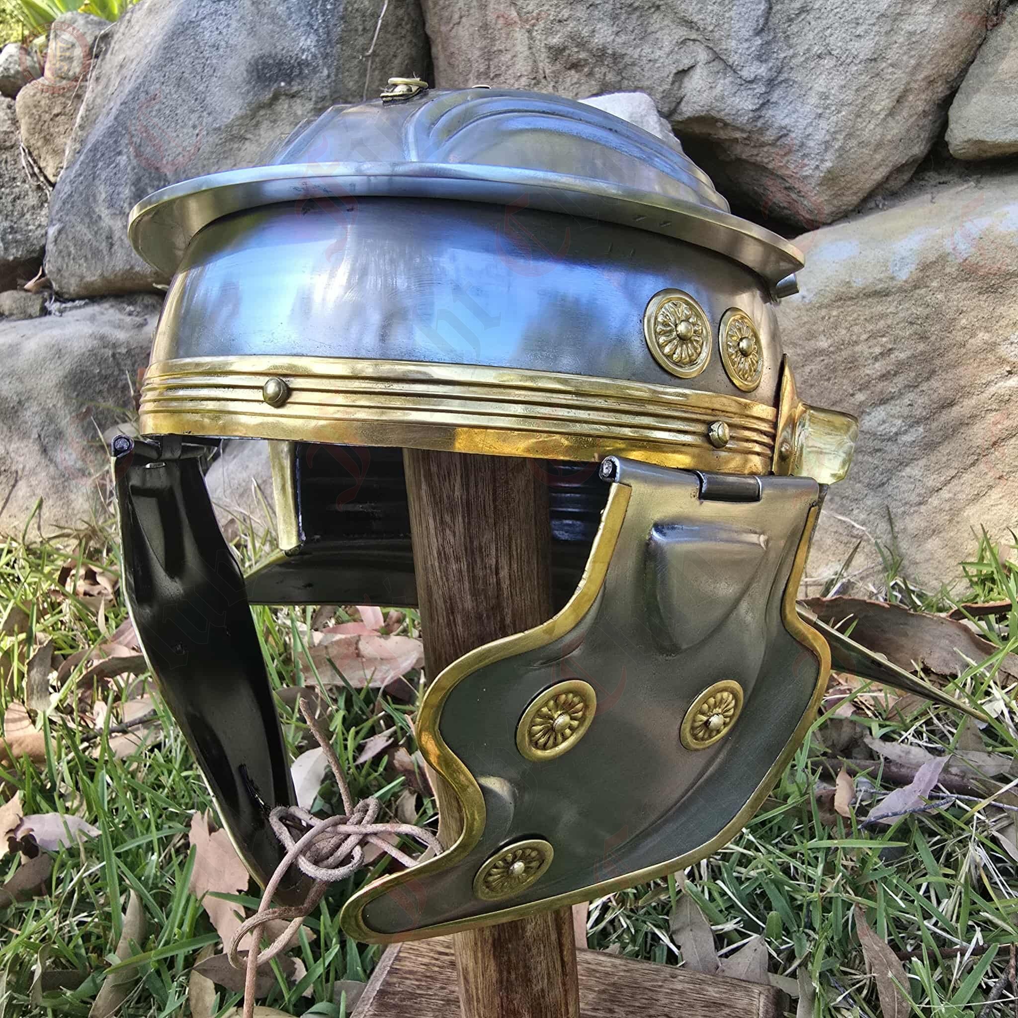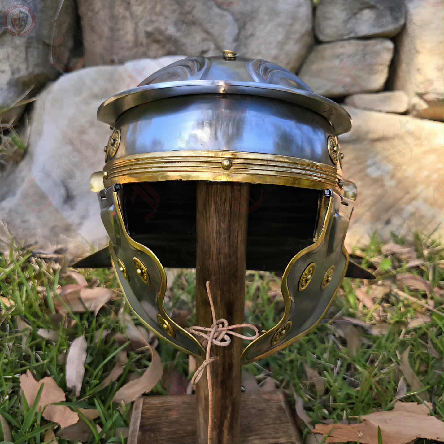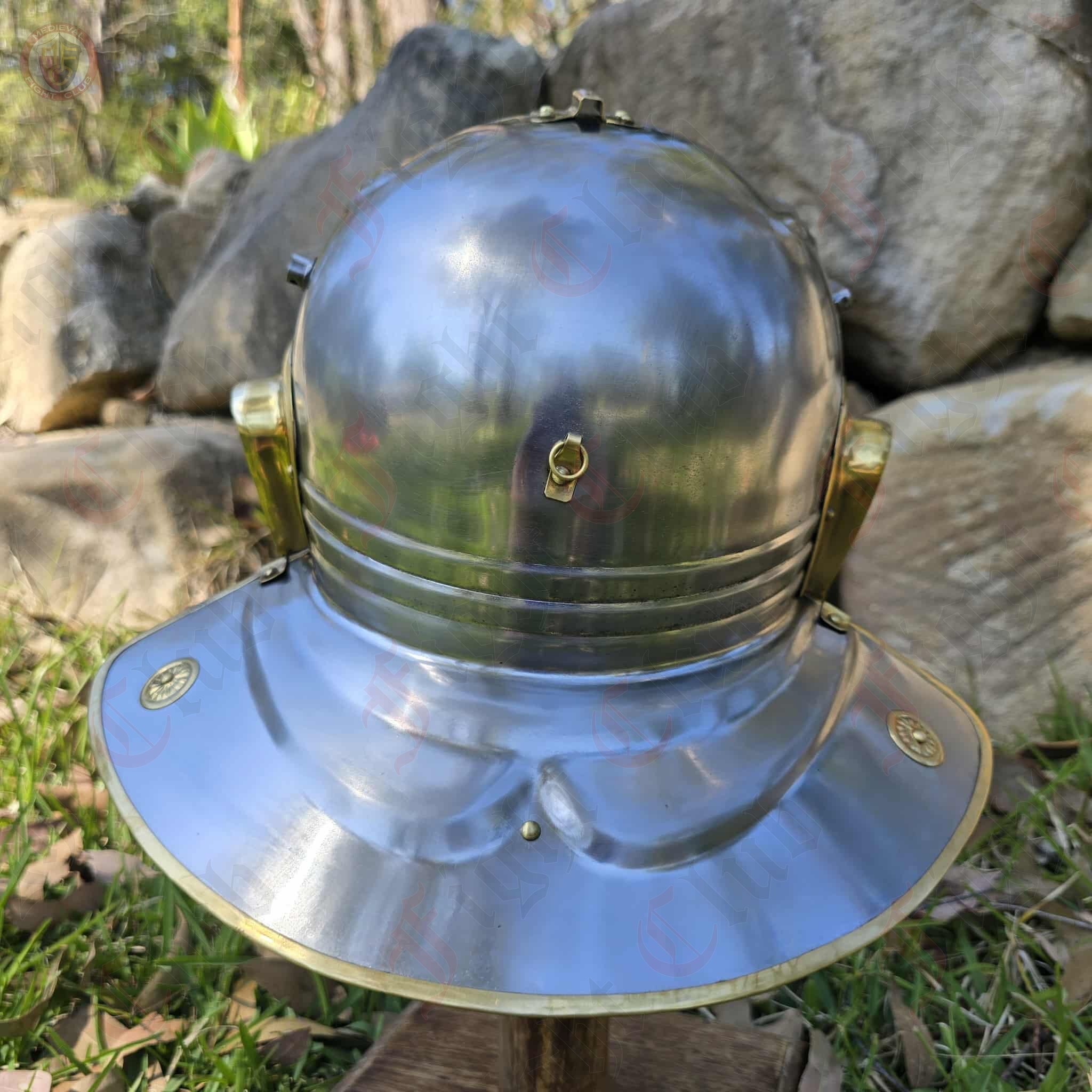 Made from durable 18-gauge steel with brass accents, it features the classic raised eyebrows, reinforced brow band and protective neck guard that defined Roman craftsmanship. The open-faced design offers excellent visibility while still providing solid coverage to the cheeks, sides and back of the head.