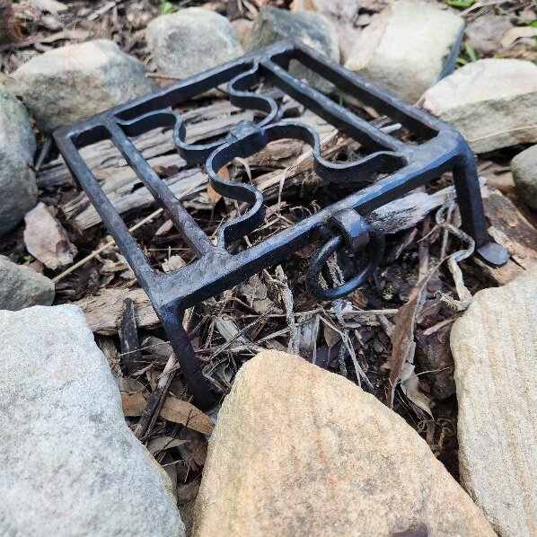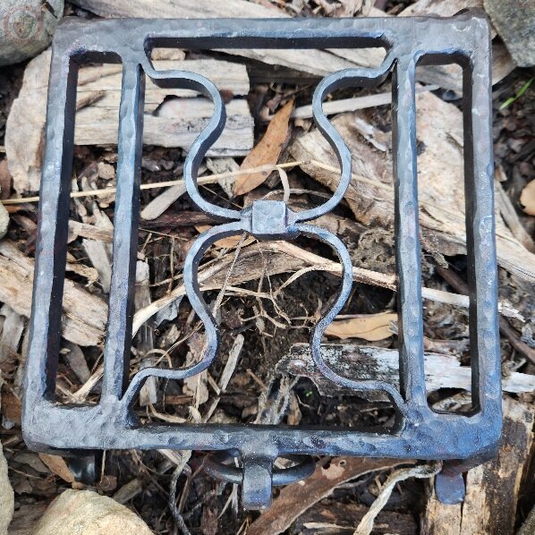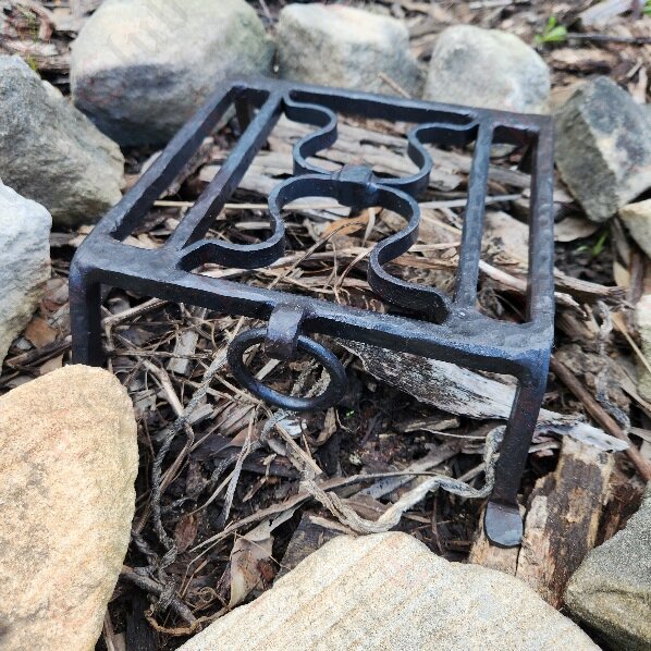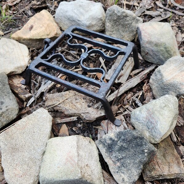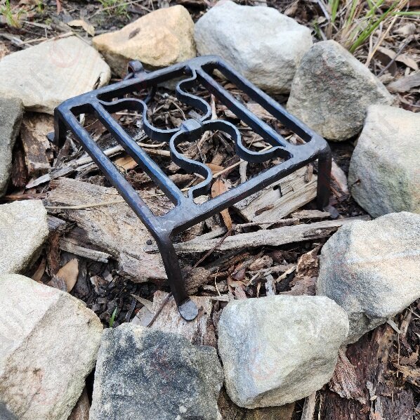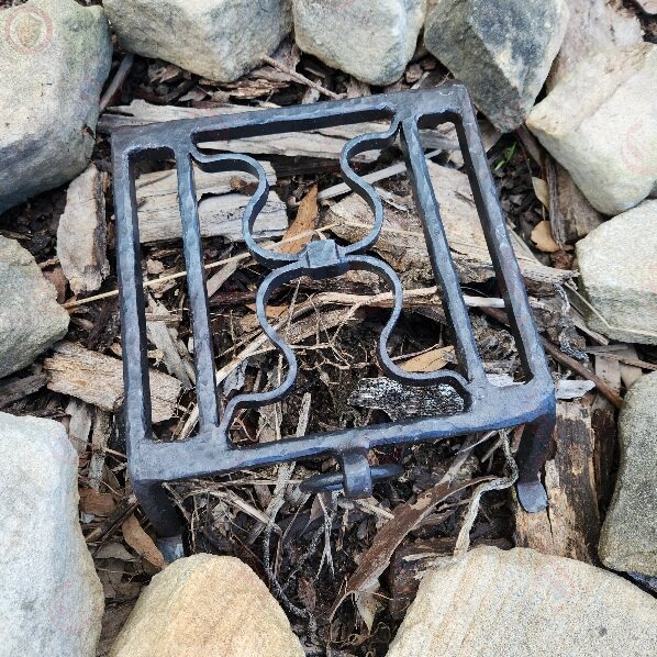 The gridiron is made of four bars, with two of them forming short legs and feet, and the other two forming decorative omega shapes that function as a plate for resting kettles, cauldrons, pots, skewers or other equipment.