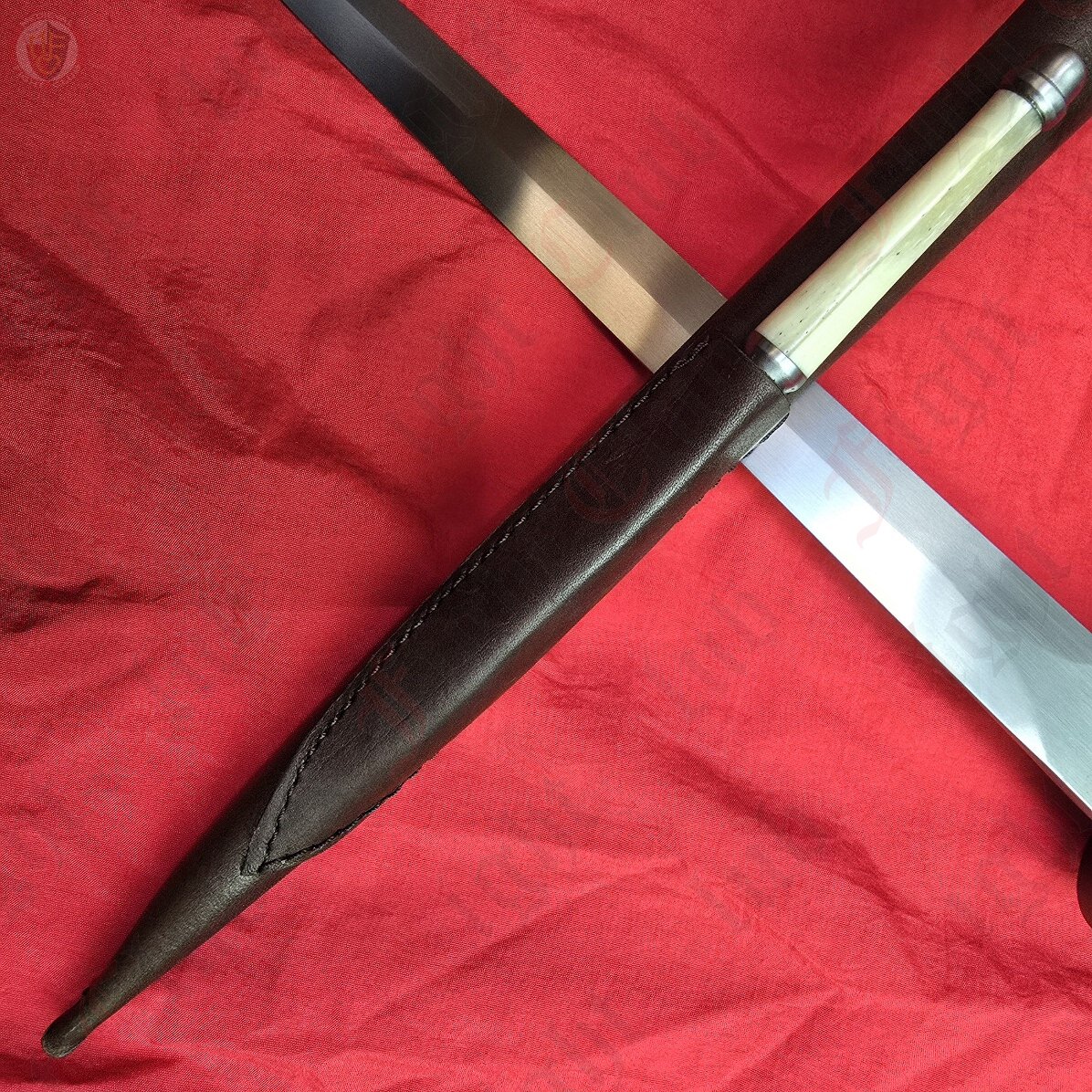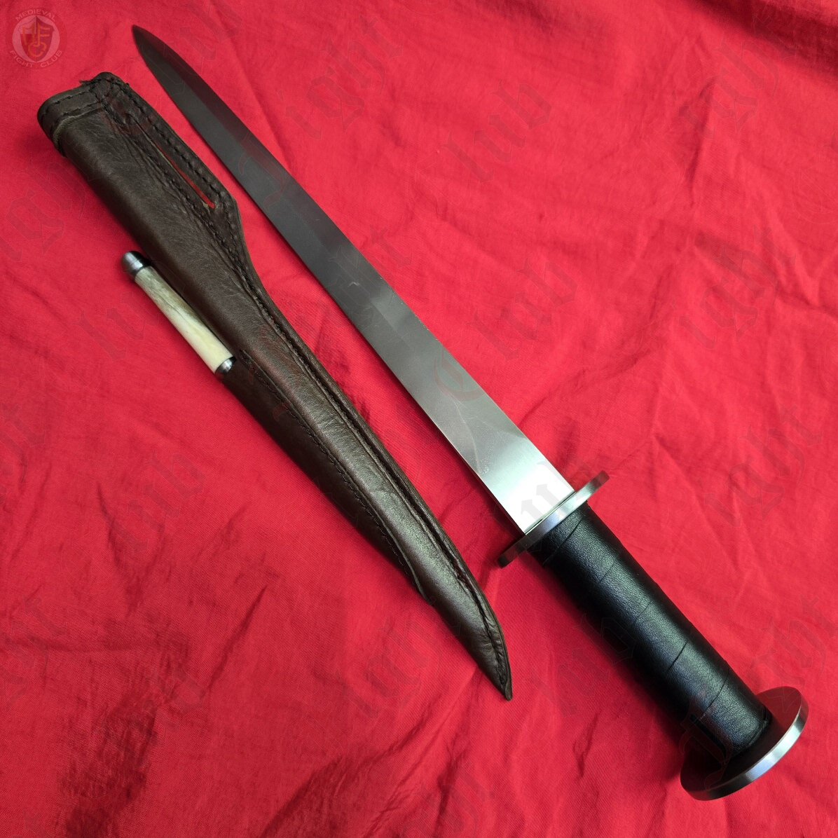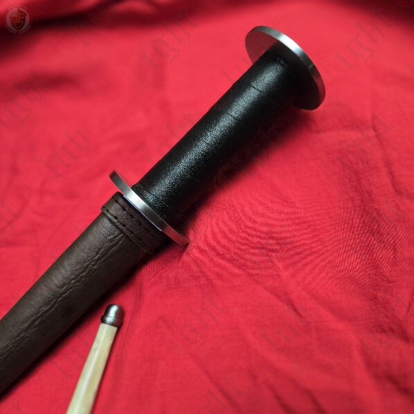 This dagger features a circular brass guard & pommel, leather grip and full tang blade that is peened through the pommel. It also includes a leather sheath with belt loop.