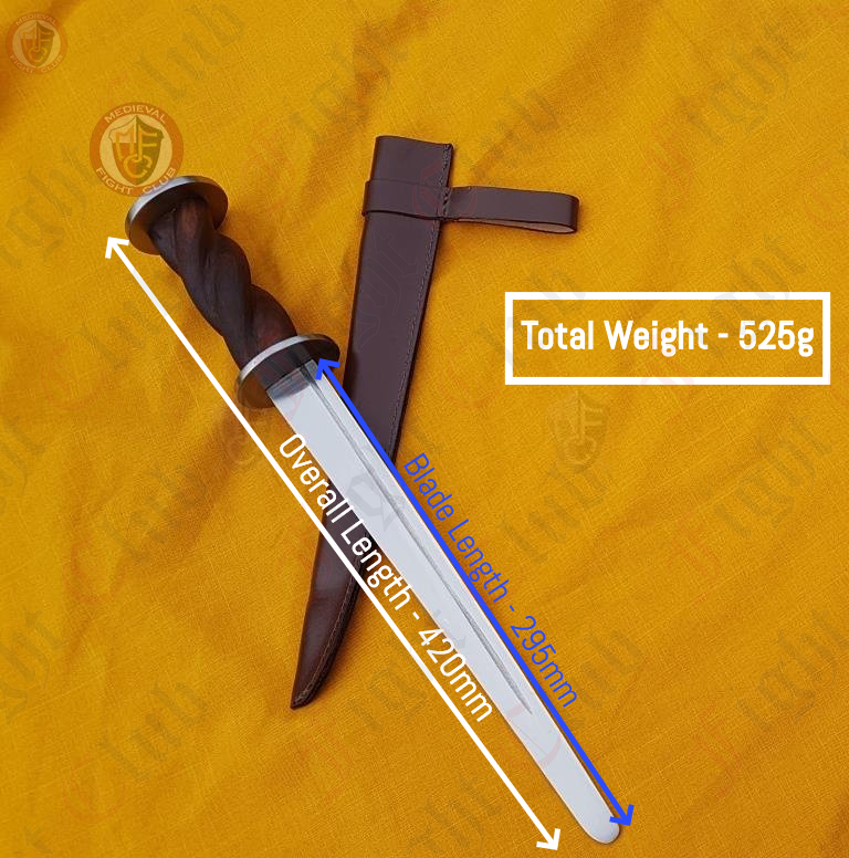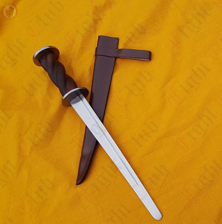 Our rondel dagger is loosely based on an original find dated to the 15th Century, with the same twisted handle shape. It is served blunt, and ready to be used in re-enactment and training.