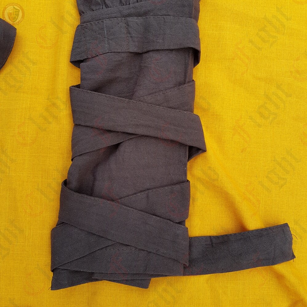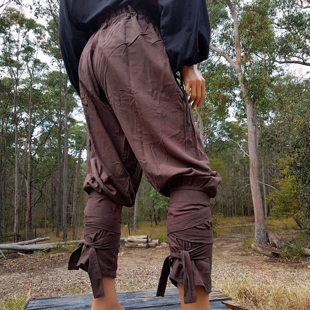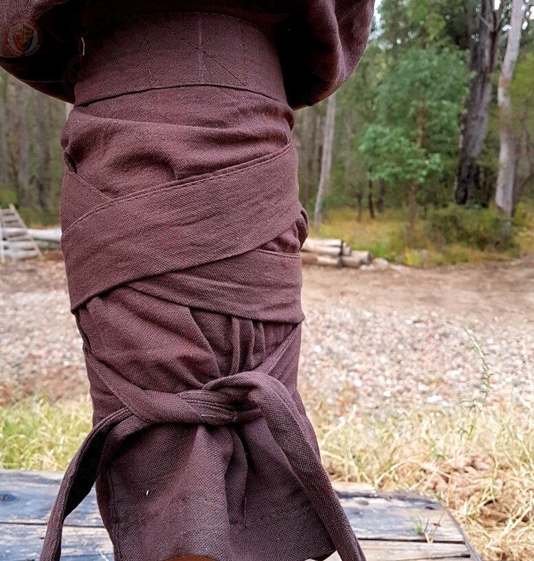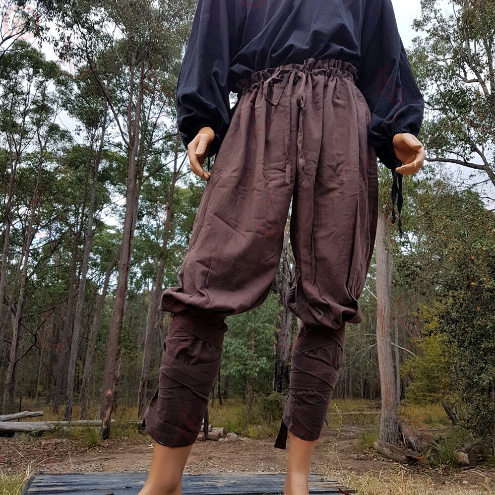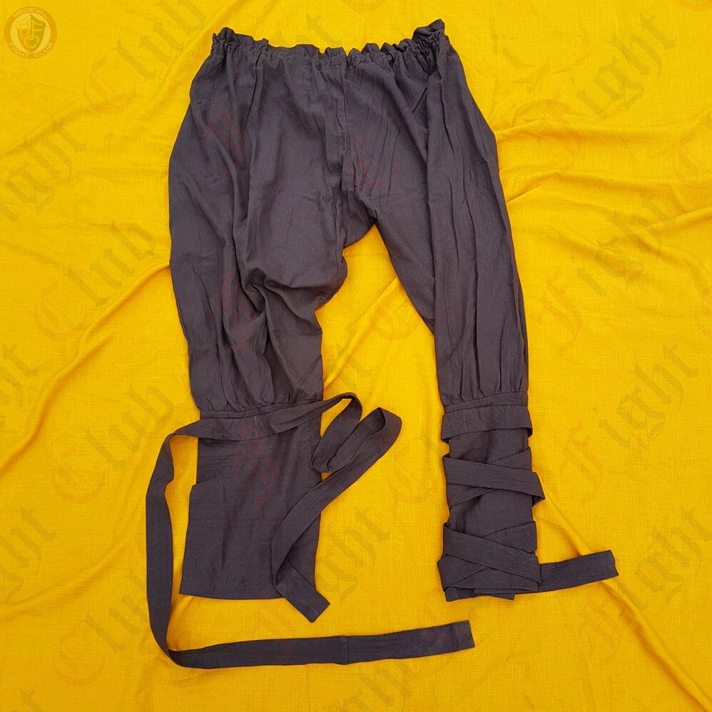 These pants are indicative of the style worn by many of the Viking Rus cultures. Baggy at the top and tighter around the calf. This pair have leg ties/wraps attached to each leg. The waist has a drawstring tie.