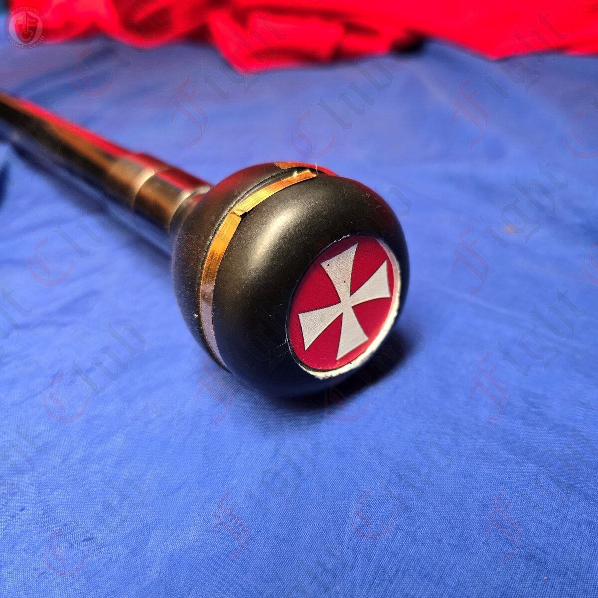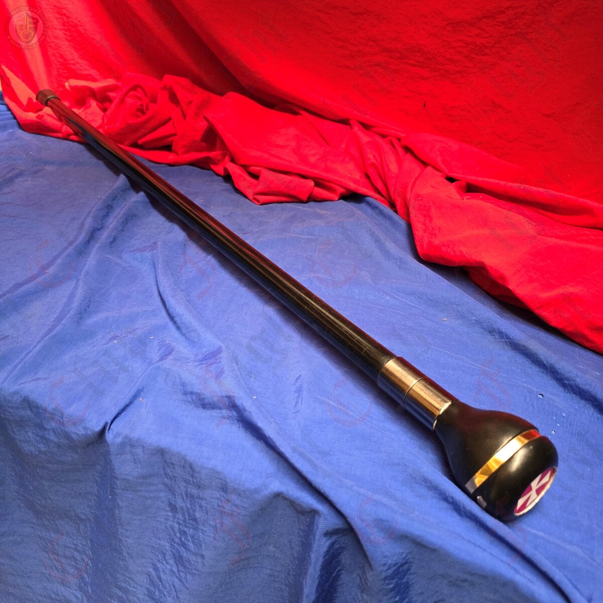 This eye-catching cane has a pear shaped head with embedded white cross on red background.