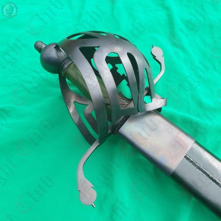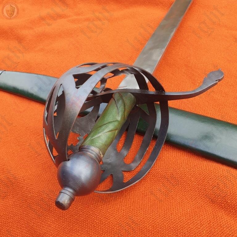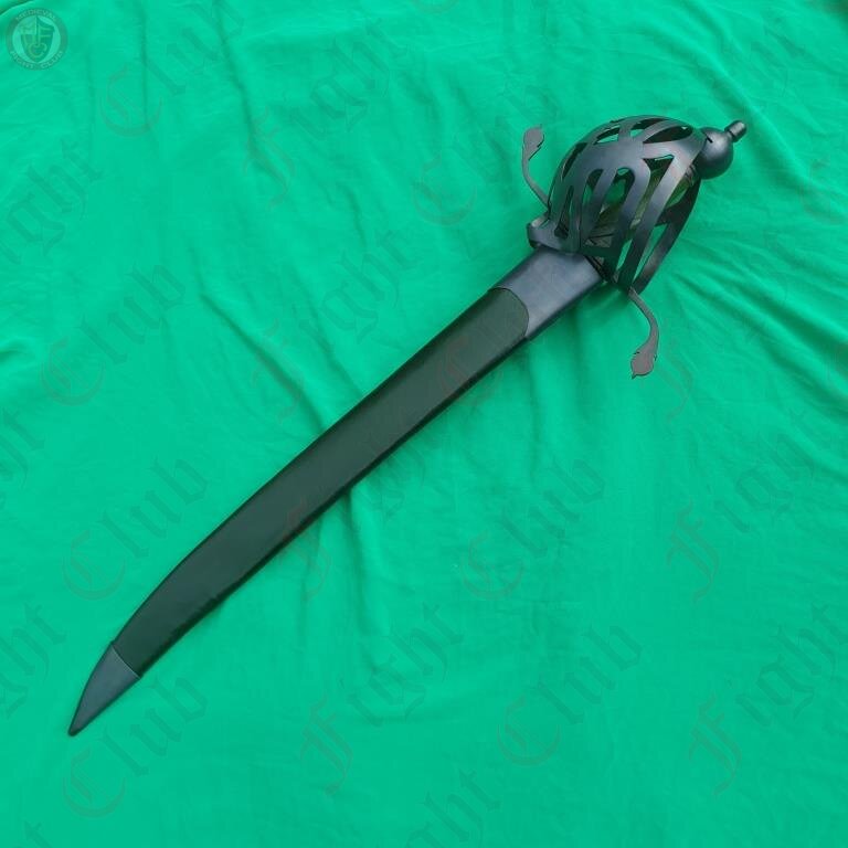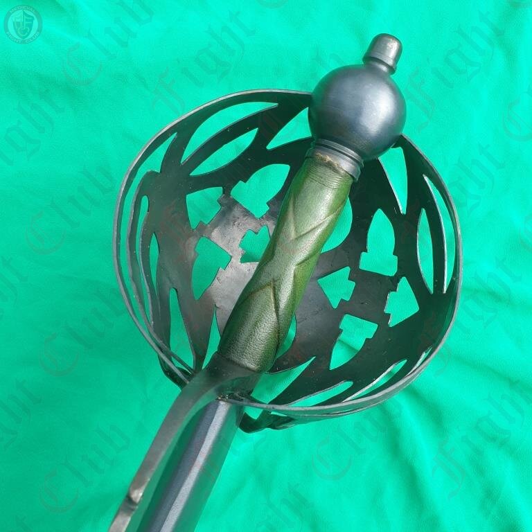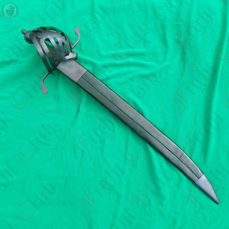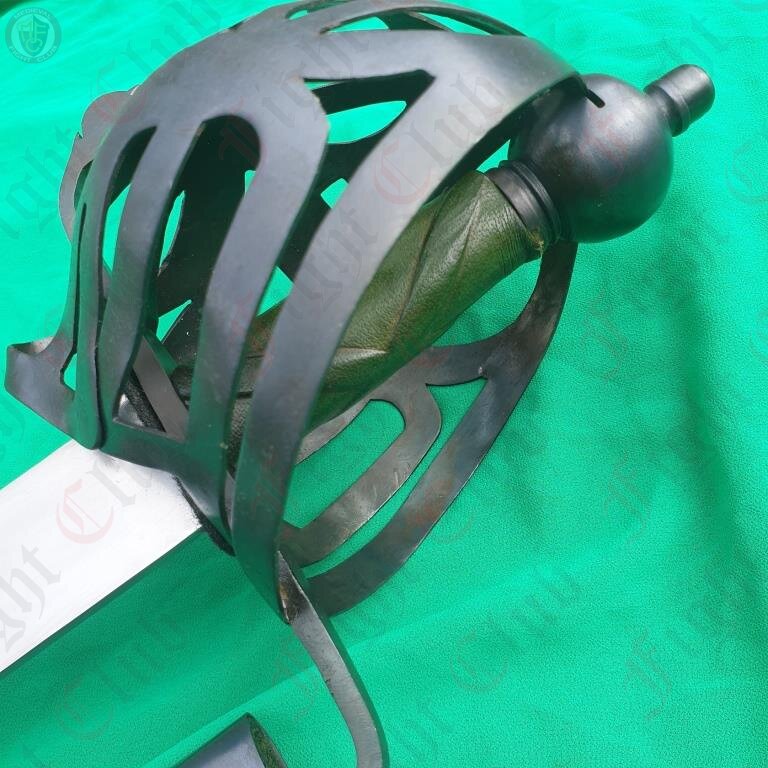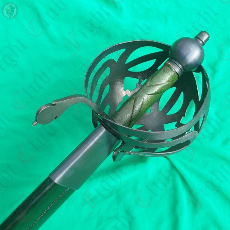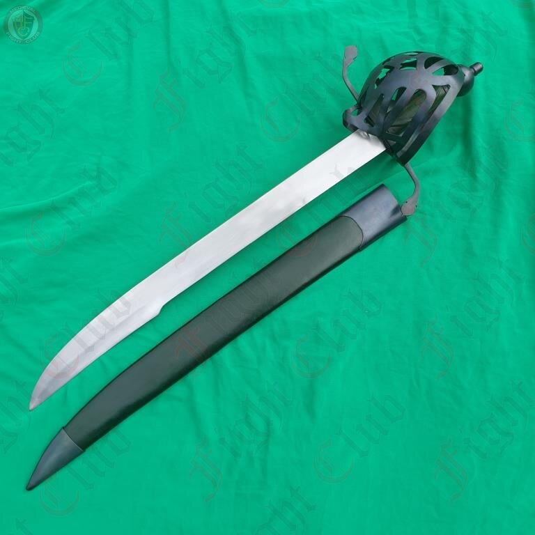 A rather imposing blade, the Scottish Cutlass is an impressive piece based off of designs used in Scotland. Featuring a uniquely patterned basket hilt, a wide and robust blade and a green leather grip and soft scabbard, this fearsome weapon is a fine addition to any reenactor's collection.