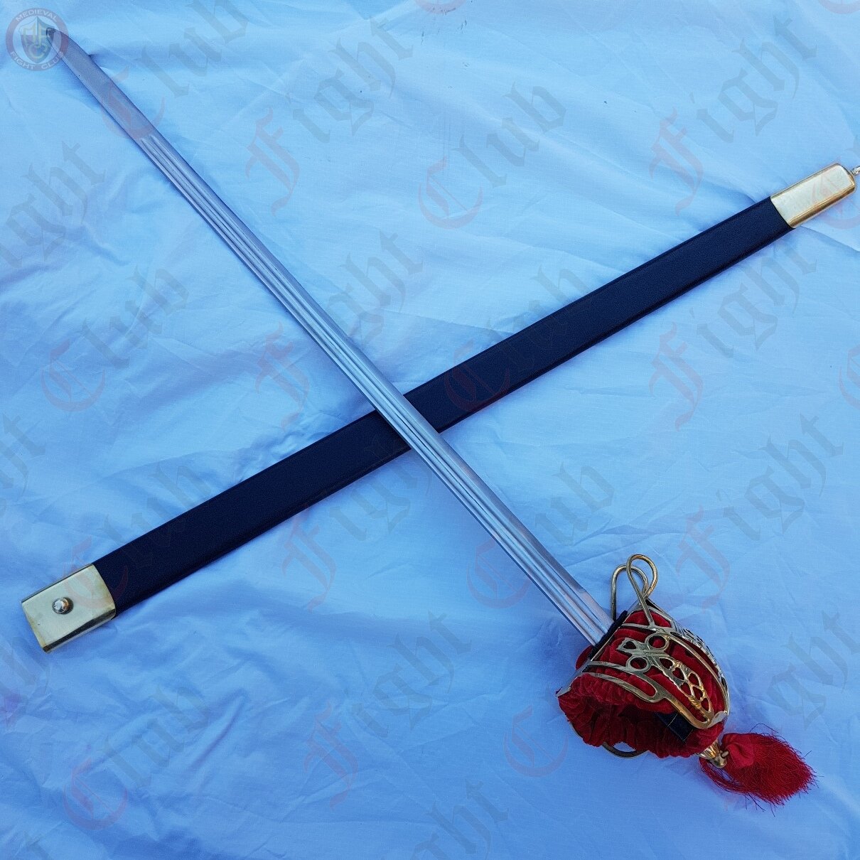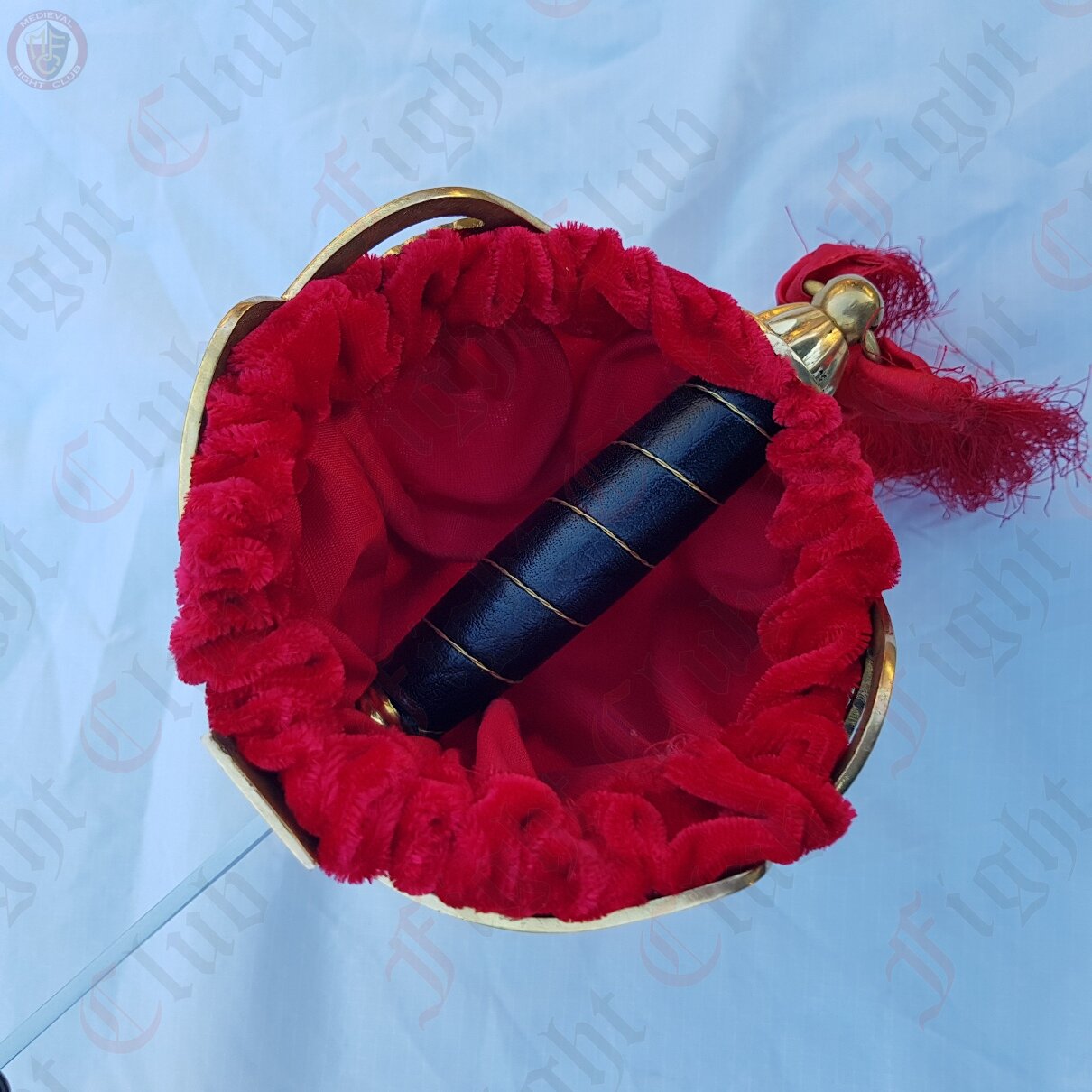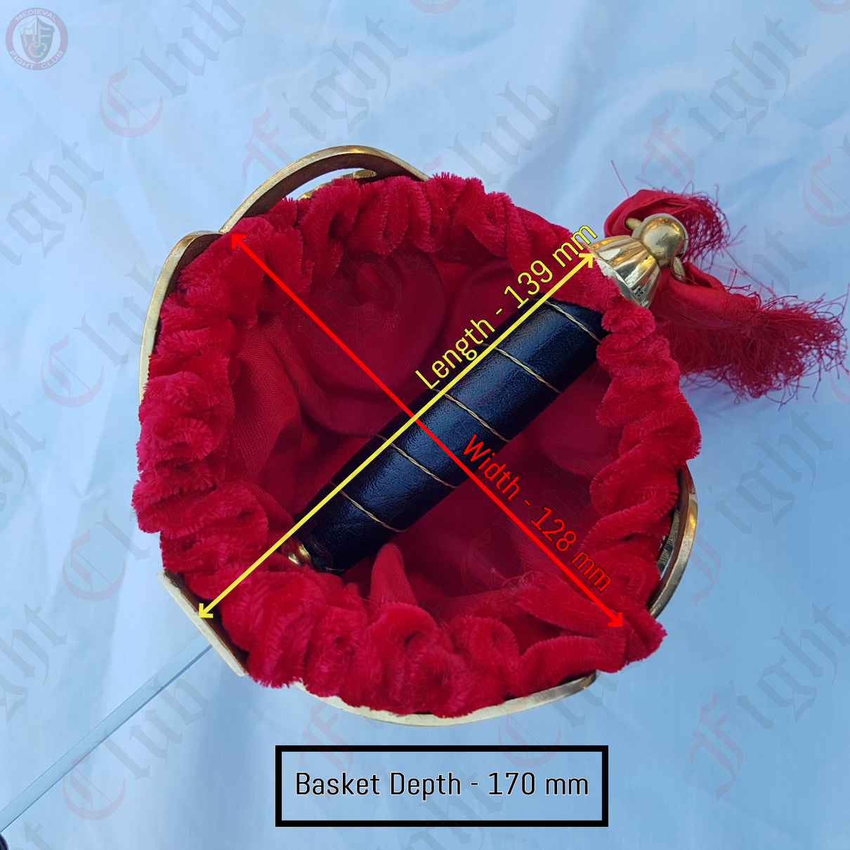 This Sword is a replica of a 17th century basket-hilted Claymore sword.The brass basket is adorned with heart-shaped cut-outs and expertly executed groovings.The blade has double fuller running along the center. It comes with a scabbard covered with black leather and brass fixings.