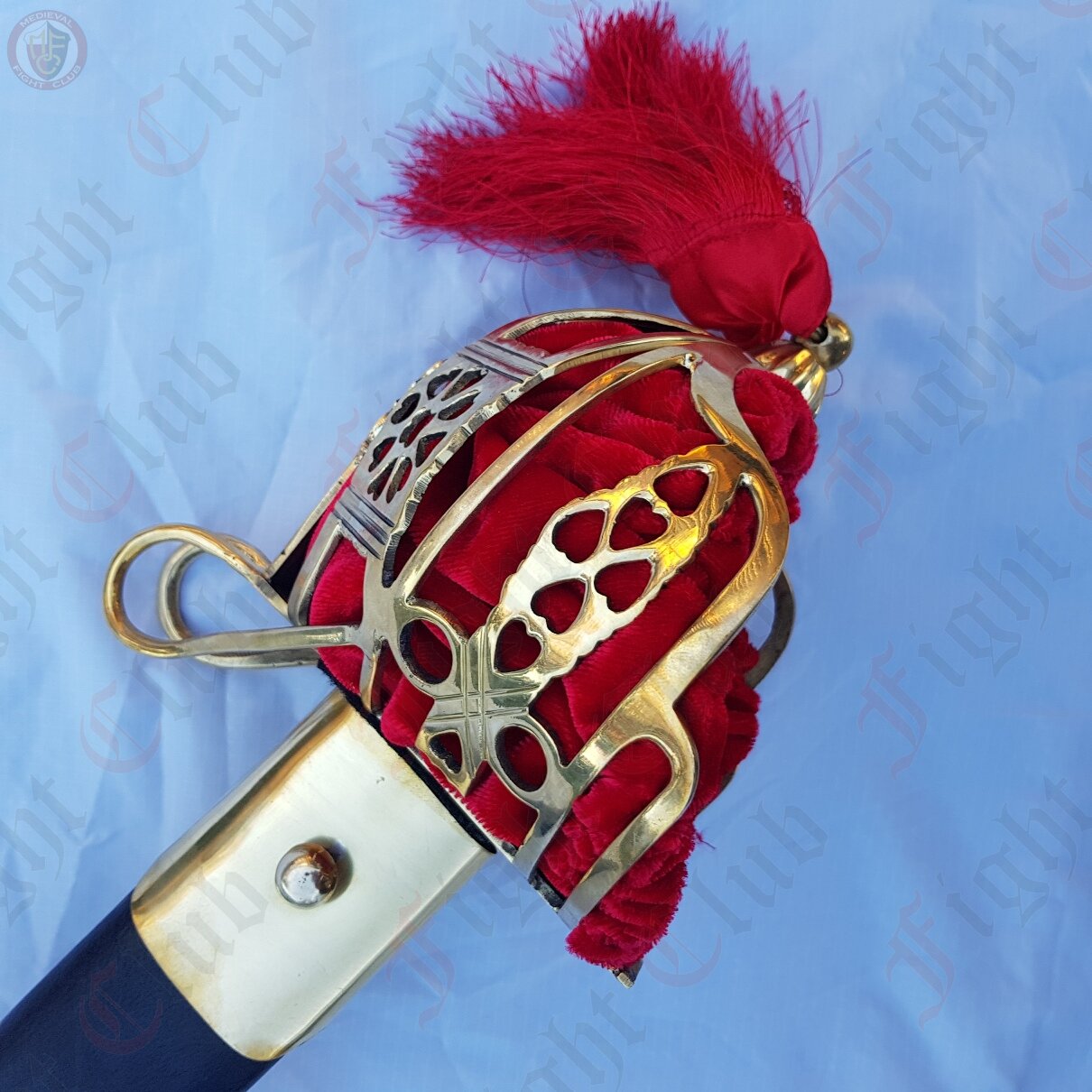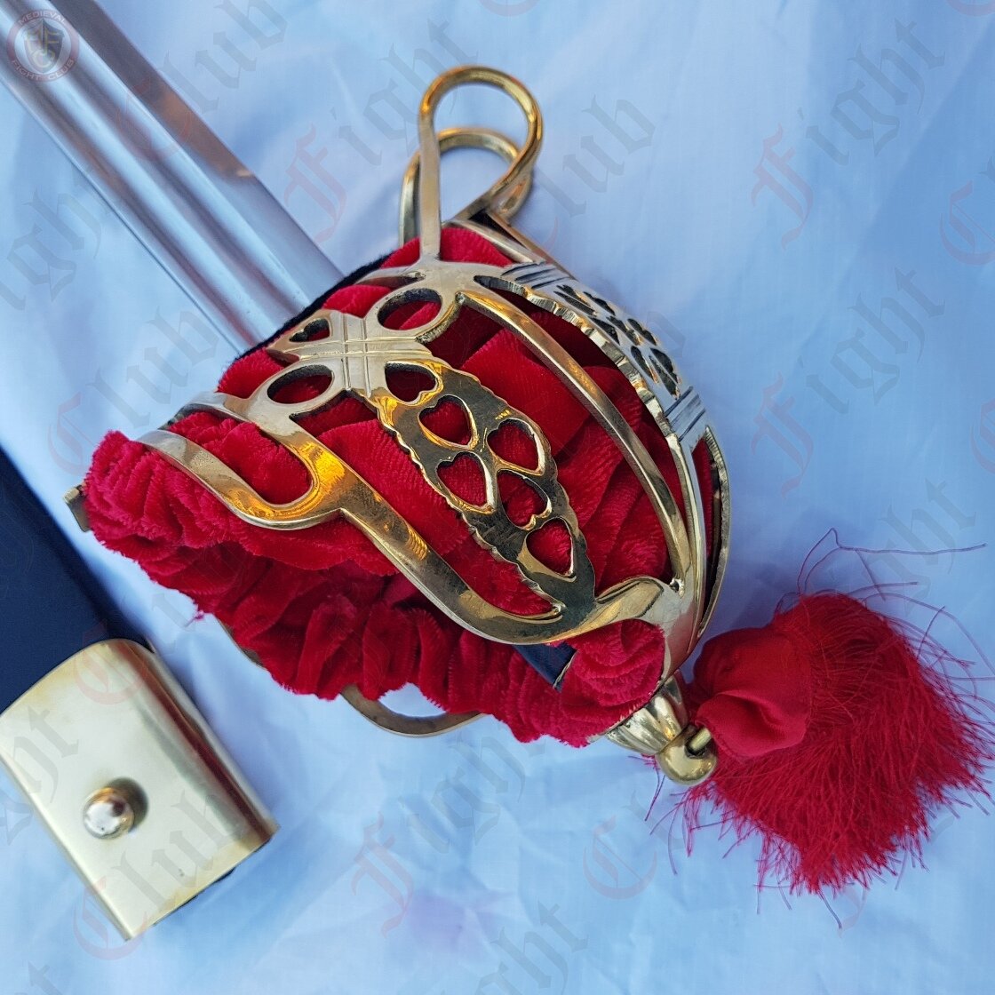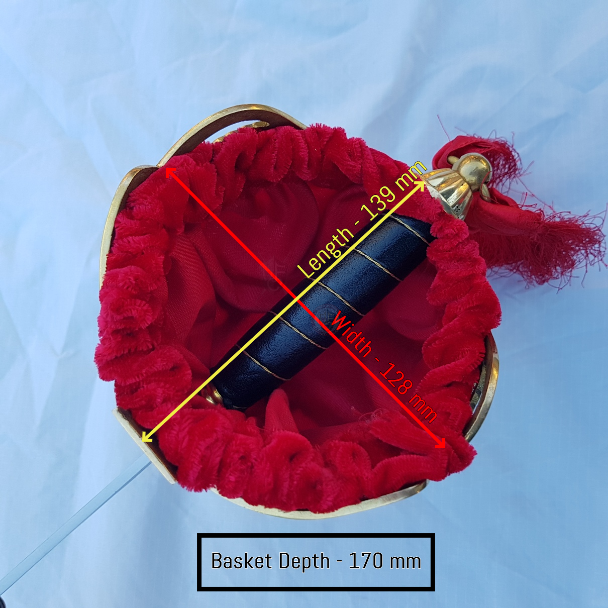 This Sword is a replica of a 17th century basket-hilted Claymore sword.The brass basket is adorned with heart-shaped cut-outs and expertly executed groovings.The blade has double fuller running along the center. It comes with a scabbard covered with black leather and brass fixings.