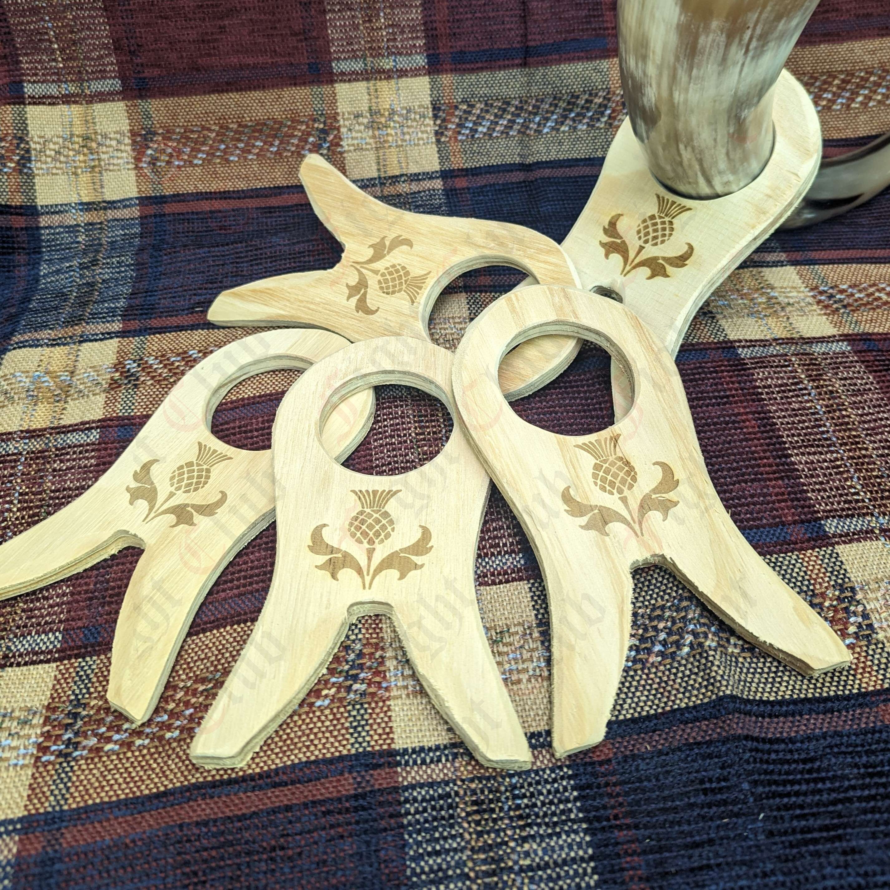 This horn stand is made from 100% sustainable Australian pine right here in Australia in the Fight Club workshop. After sanding we burn the Thistle pattern straight into the wood (one side only).