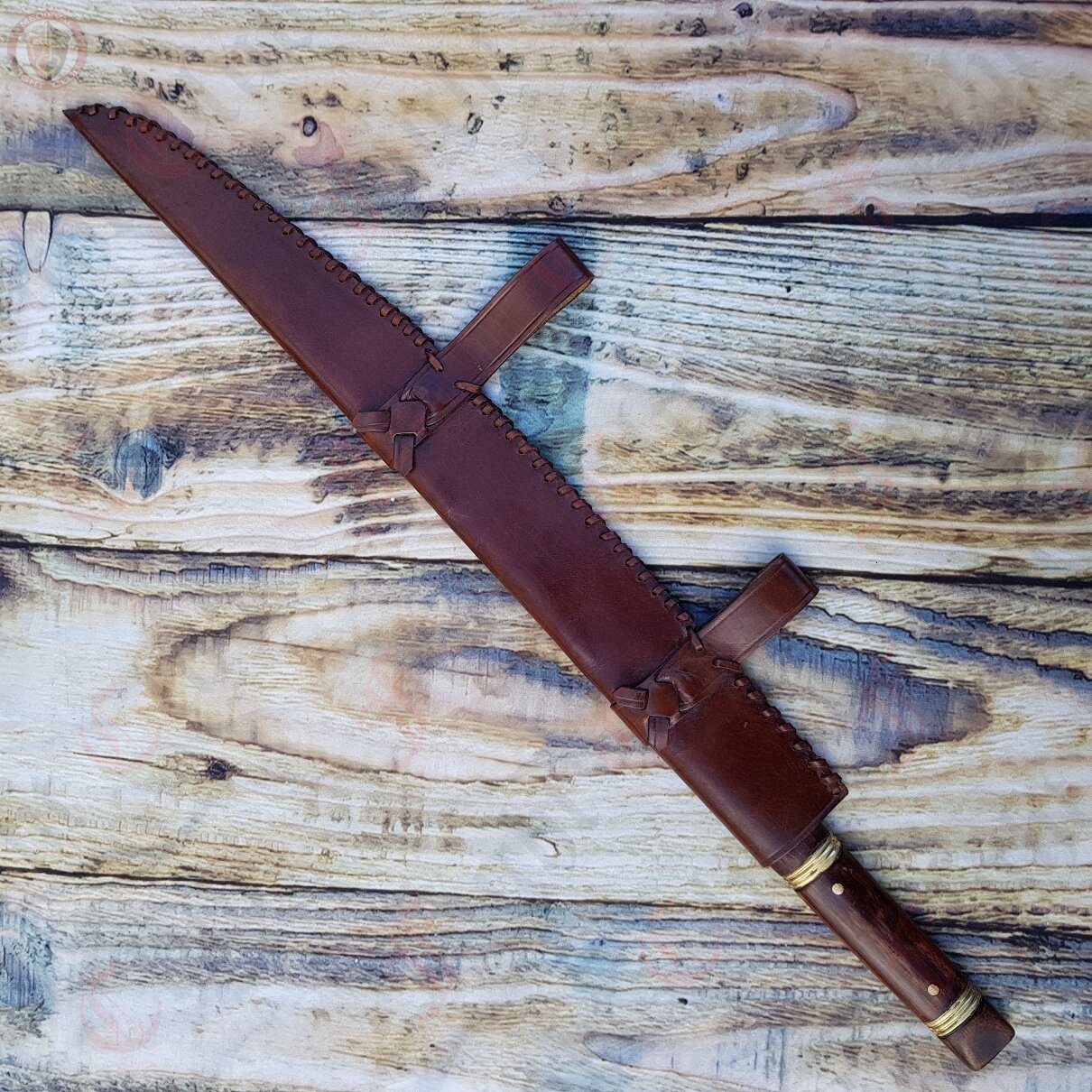 It has a hand made untempered carbon steel blade with wood grip and hand crafted natural - leather scabbard.