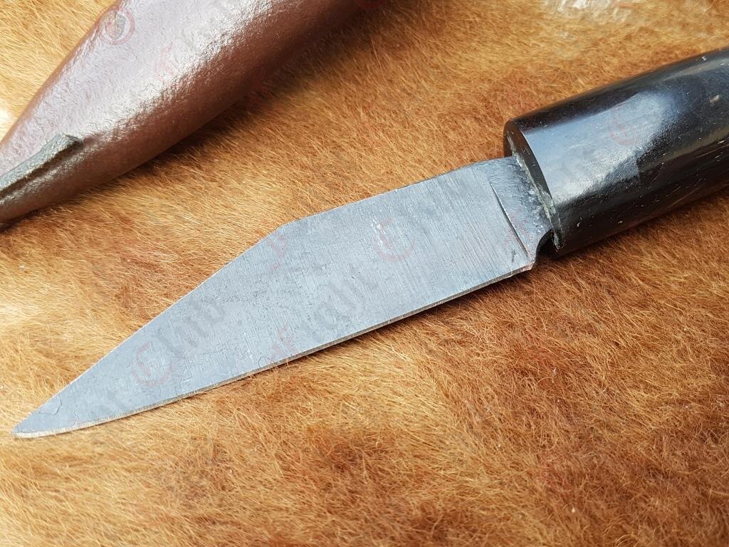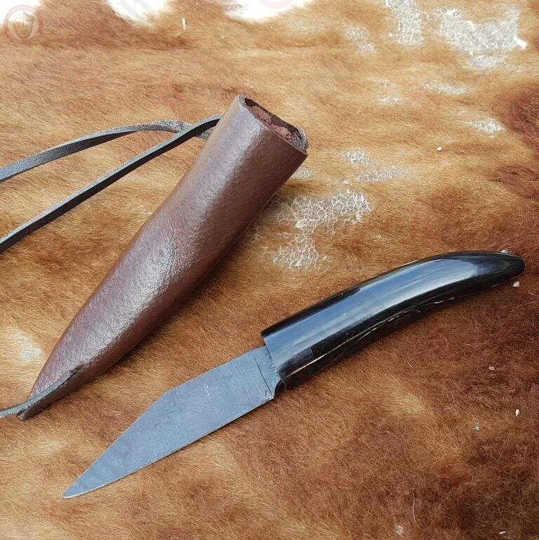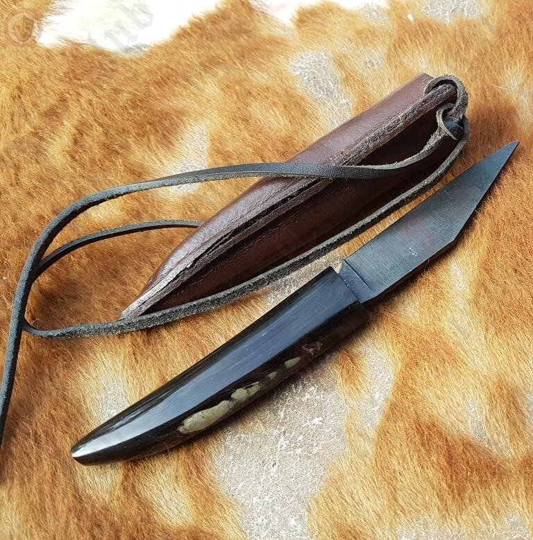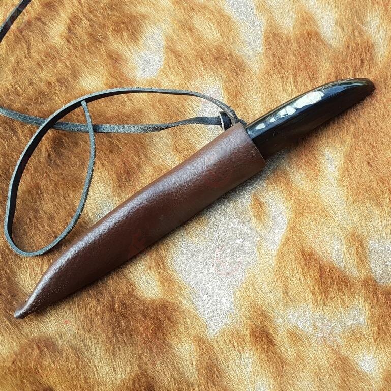 Hand forged Saxon utility knife (Kurzsax) and hand made leather sheath. Every seax is handmade so slight variations in size and shape can occur.