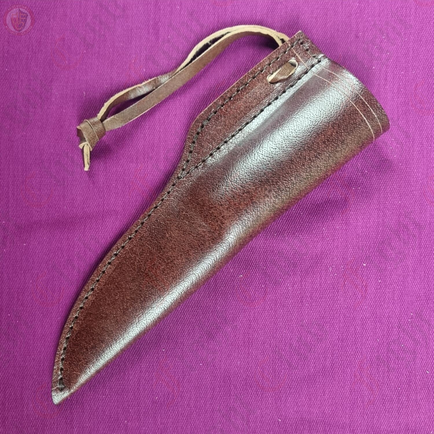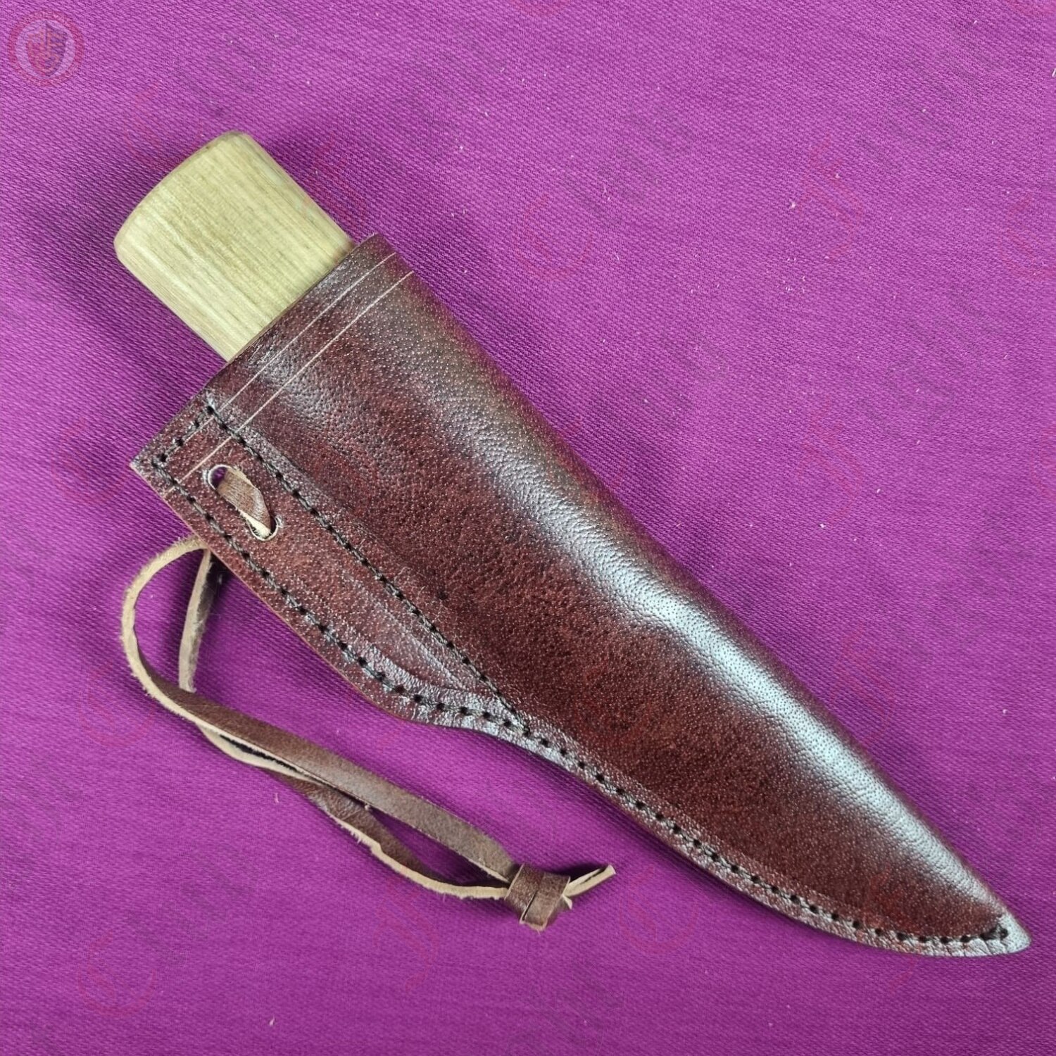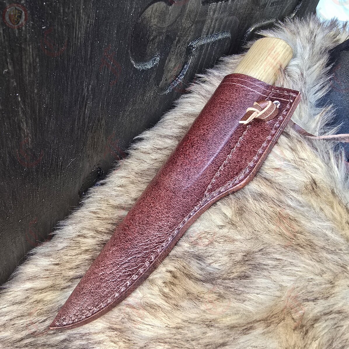 This particular seax is a standard, functional and rustic piece just ready to be picked up and used. With a sharp edge, this knife is practical and can be used just as it was a thousand years ago. It features a full tang, high carbon steel blade fitted to a sanded wooden hilt. The hilt features no decorations - letting you etch, burn or add to the blank slate as you see fit. Or, leave it blank and let the utility of the seax speak for itself. The knife also comes with a fitted leather scabbard inside which the seax sits securely, and features a leather loop for attaching to your belt.