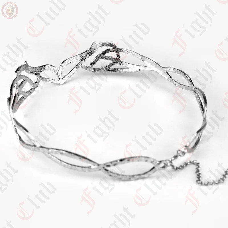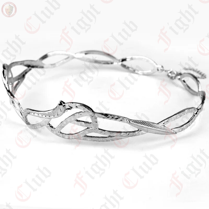 A silver coloured leaf embossed woodland coronet. Please note: picture show coronet the correct way but it works as well if not better, upside down.
