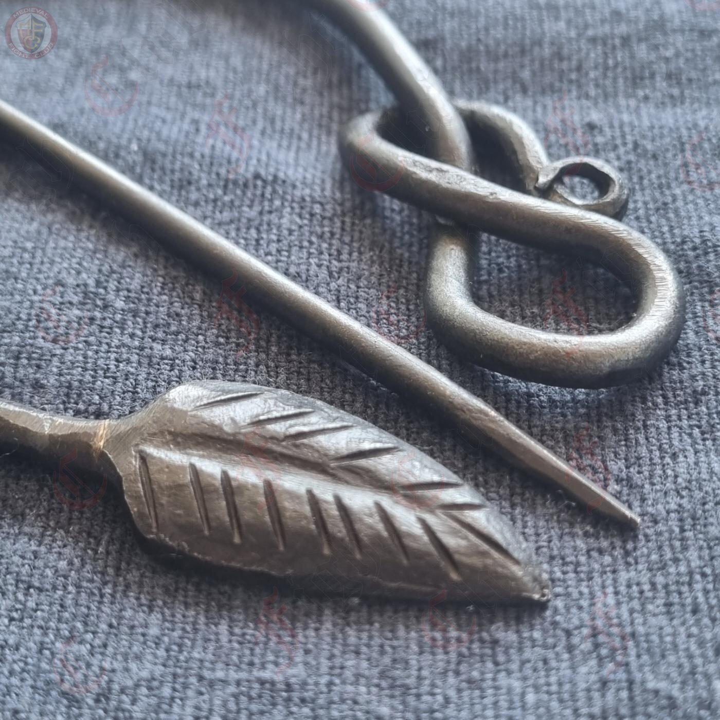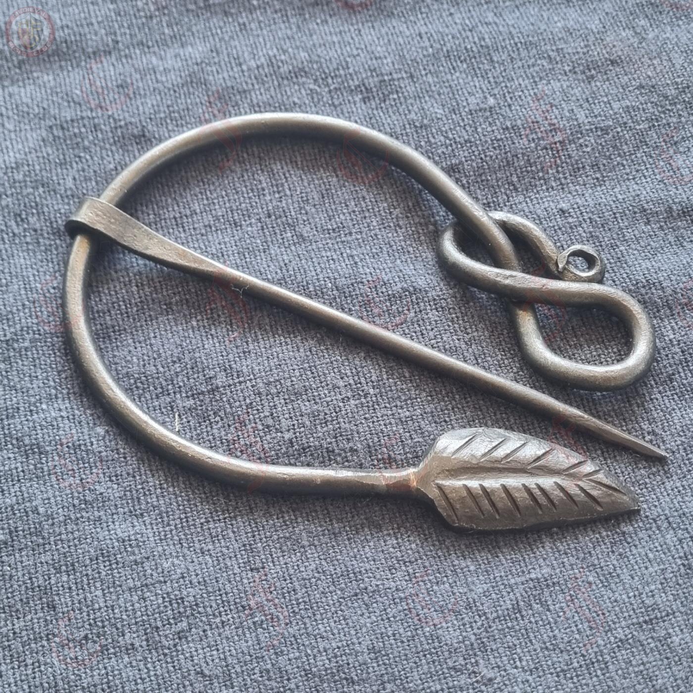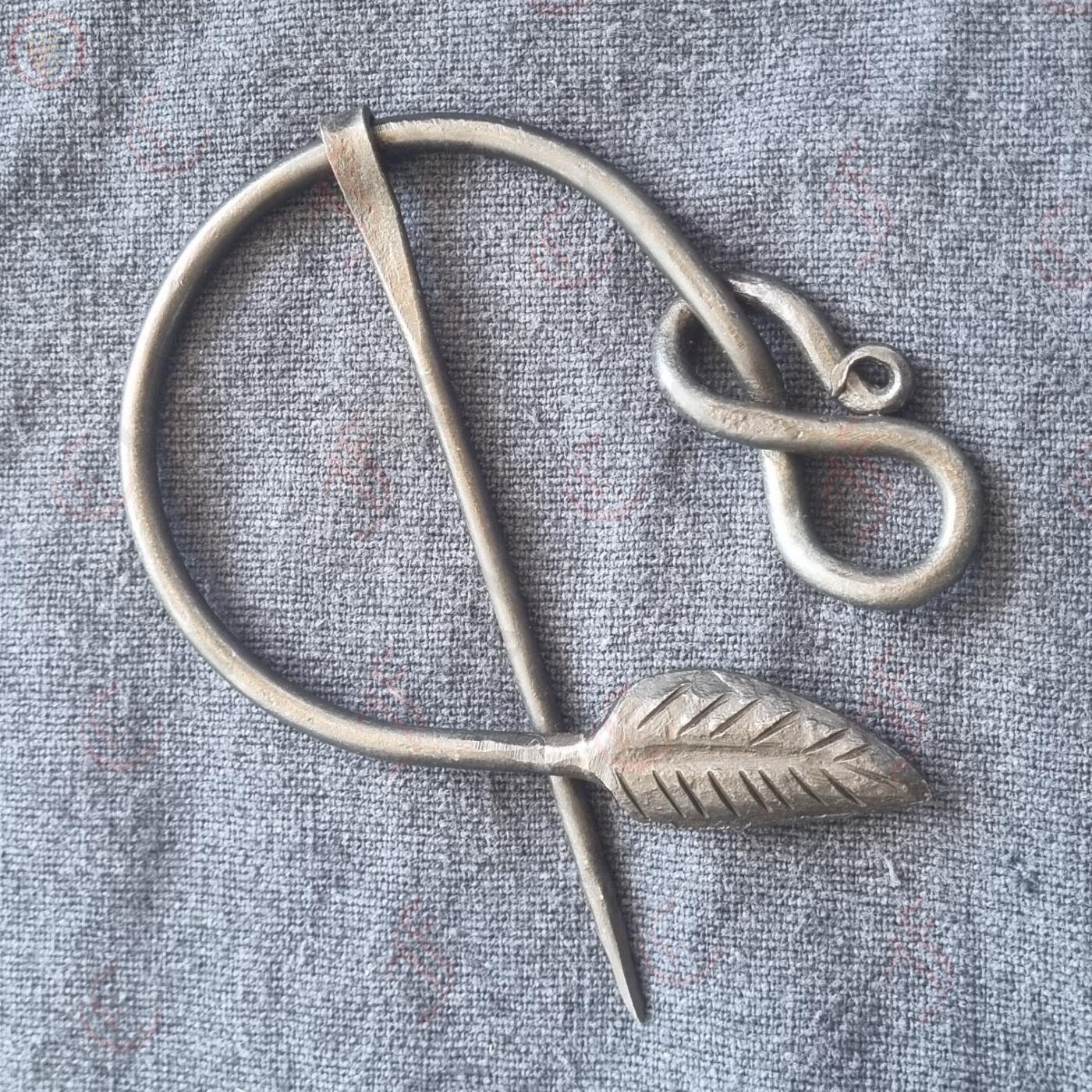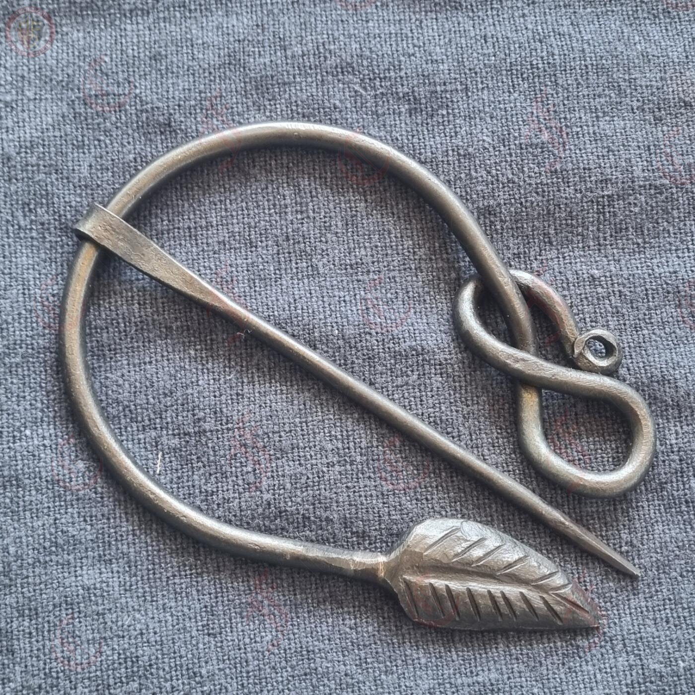 A simple, single piece wrought iron cloak pin with a leaf decoration at one end and an elaborate s-bend at the other, with a simple and sleek pin.