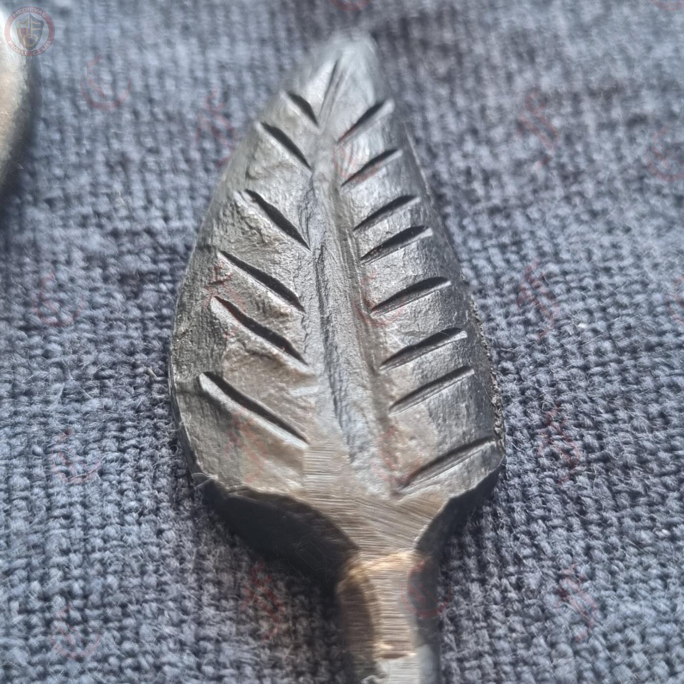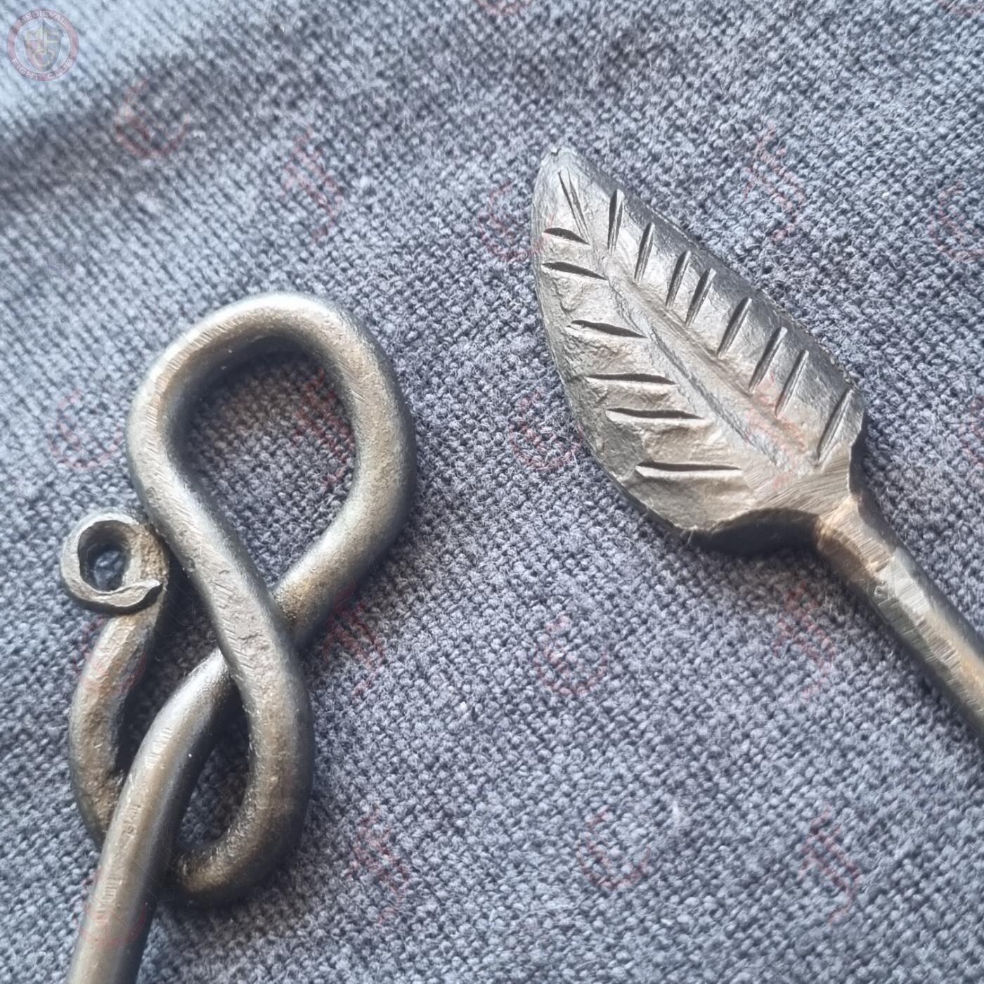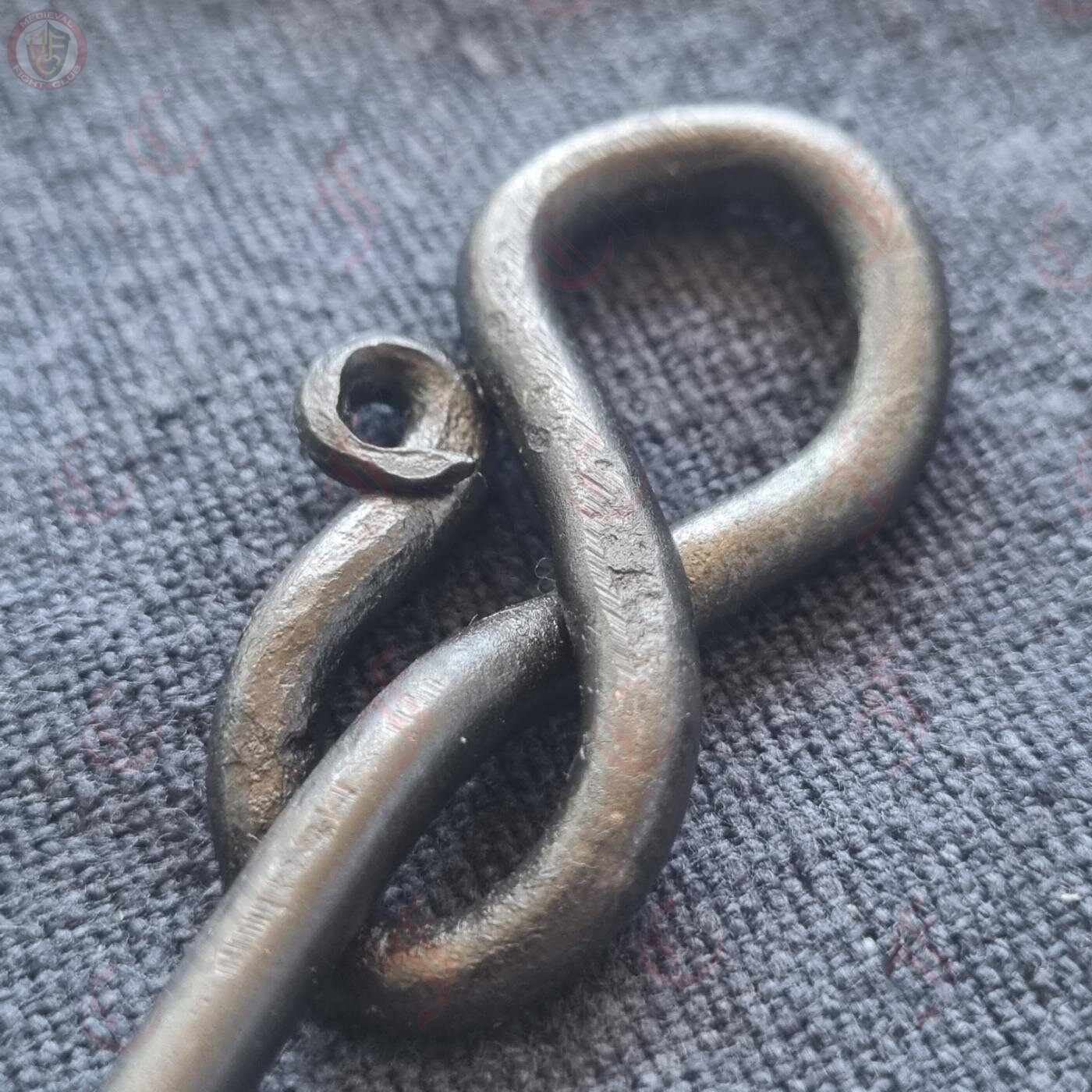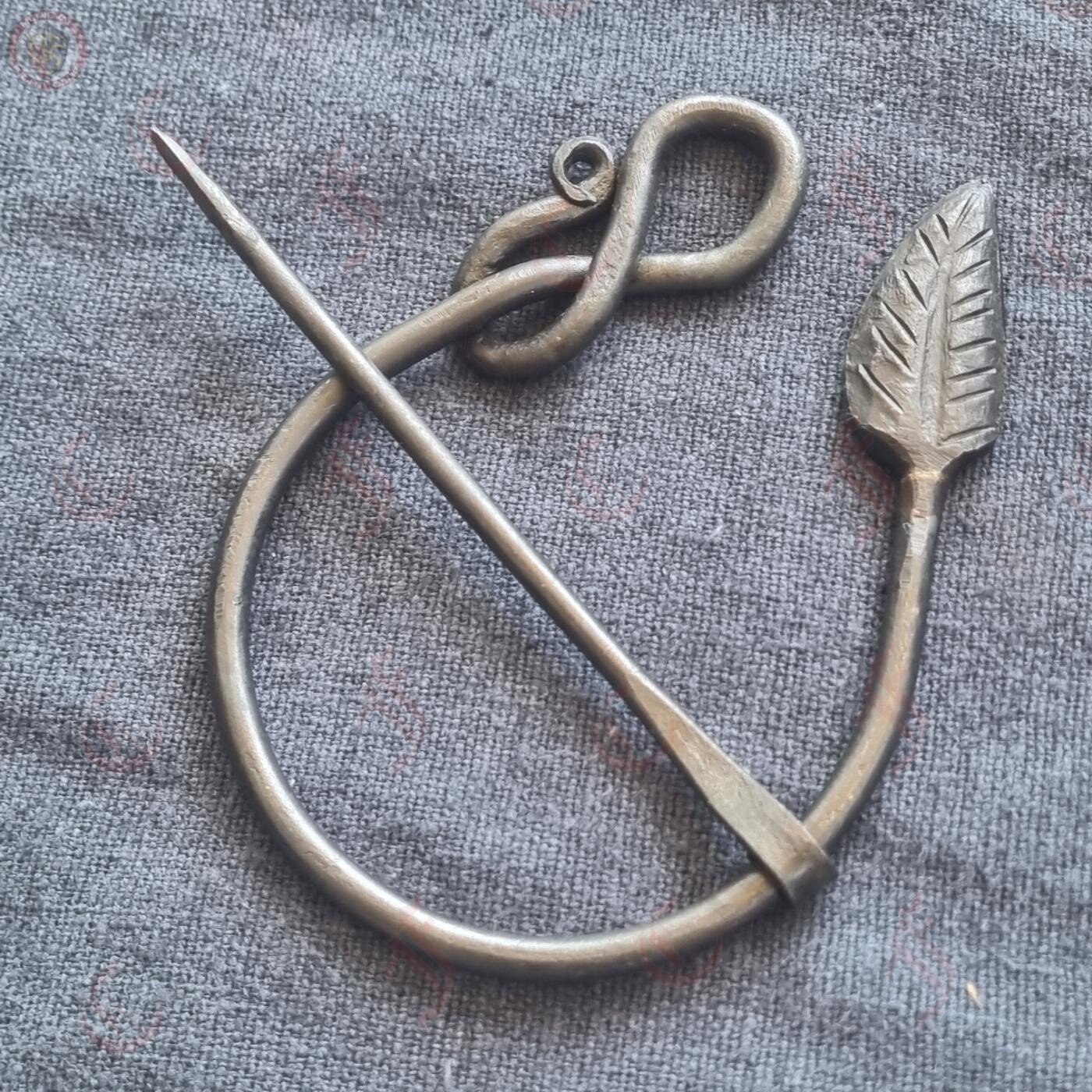 A simple, single piece wrought iron cloak pin with a leaf decoration at one end and an elaborate s-bend at the other, with a simple and sleek pin.