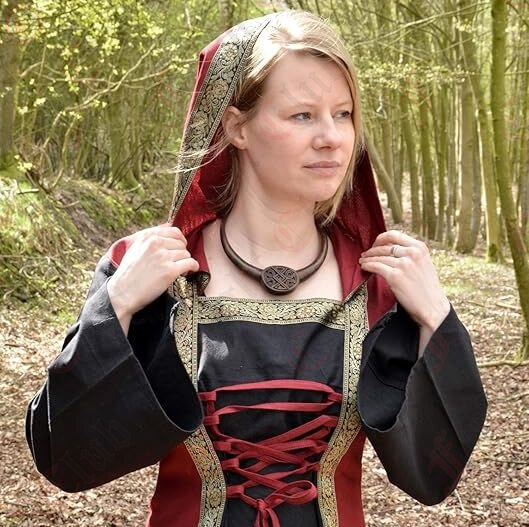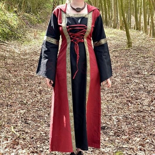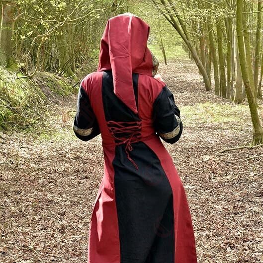 Step into a world of medieval fantasy with this beautifully crafted two-tone gown. Featuring adjustable princess sleeves, a graceful liripipe hood, and both front and back lacing, this dress is designed to contour comfortably to your shape—flattering for every figure.
