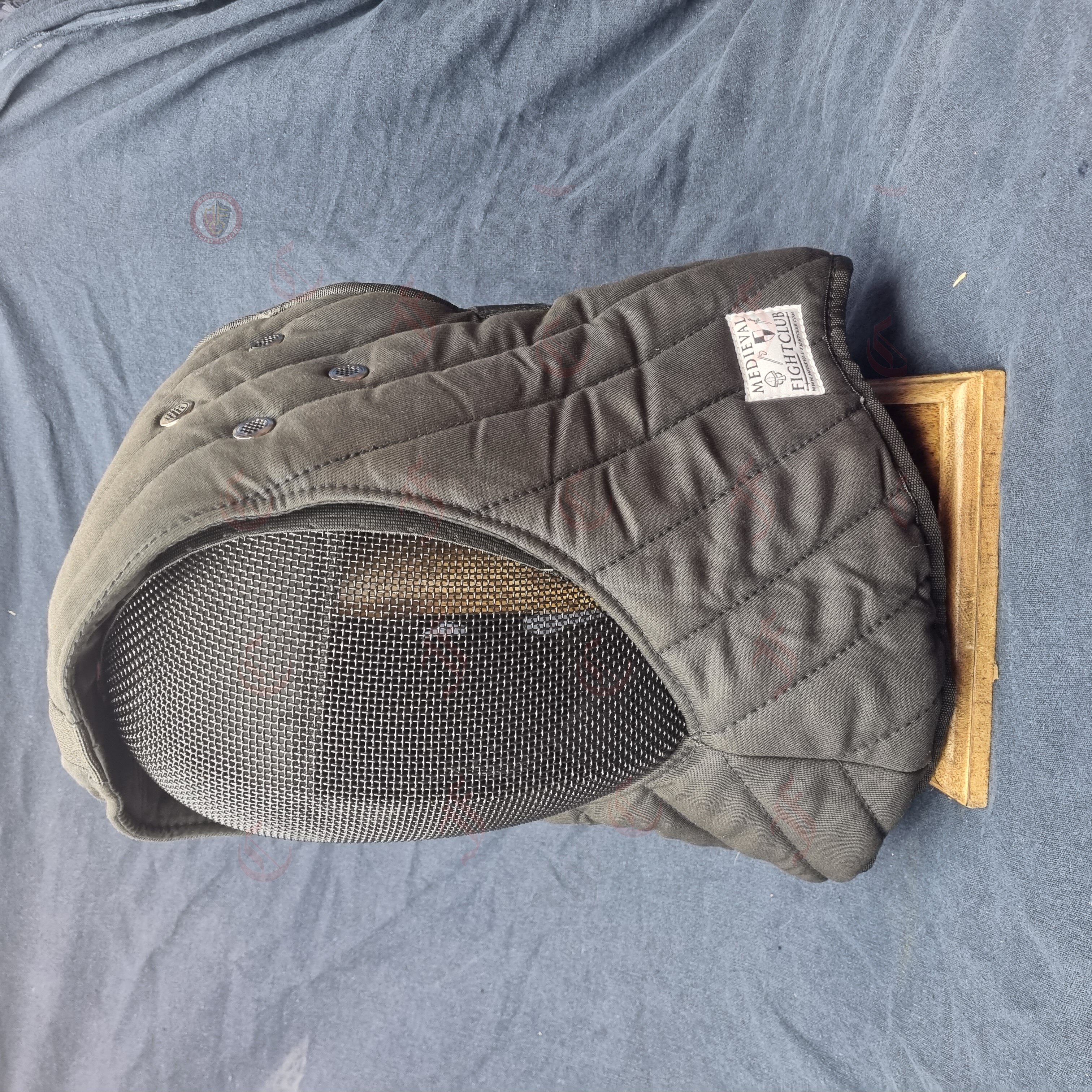 A soft padded coif for slotting over a fencing mask. A sturdy protector for all sides of the head and the front and sides of the neck. A stiff plastic insert covered in soft padding provides comfortable but durable protection for one of your most vulnerable body parts.
