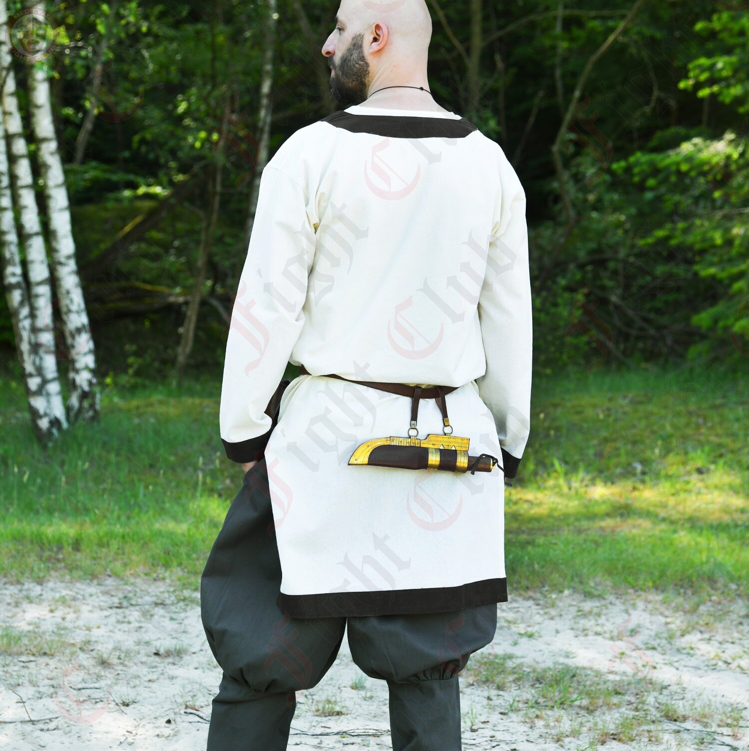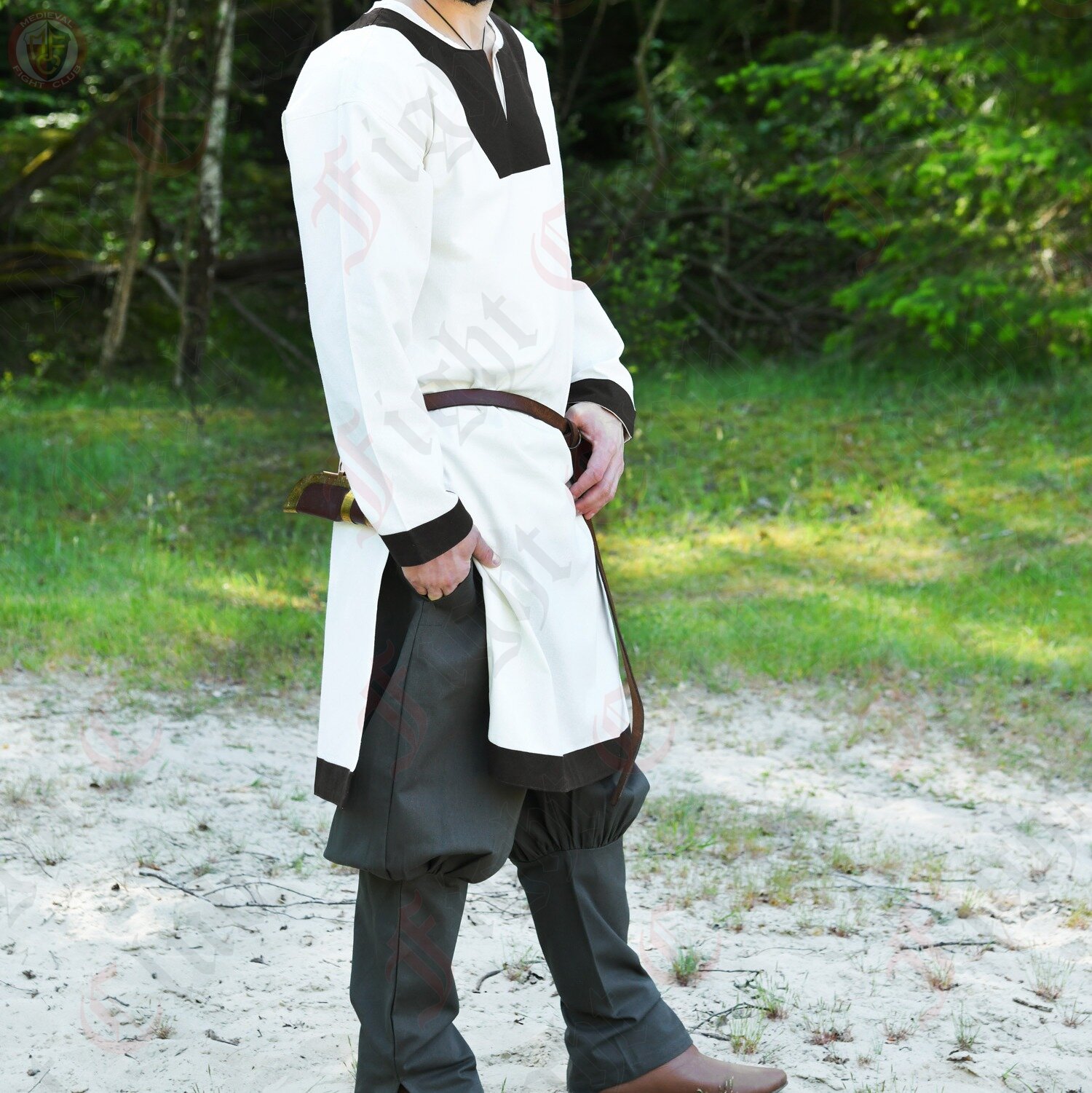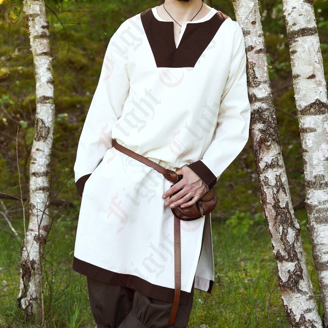 Bring subtle medieval elegance to your kit with this white cotton tunic, accented with rich brown trim along the neckline, sleeves, and hem. Crafted from lightweight yet durable cotton, it offers breathable comfort suitable for warm-weather wear or as a versatile base layer beneath heavier garments.