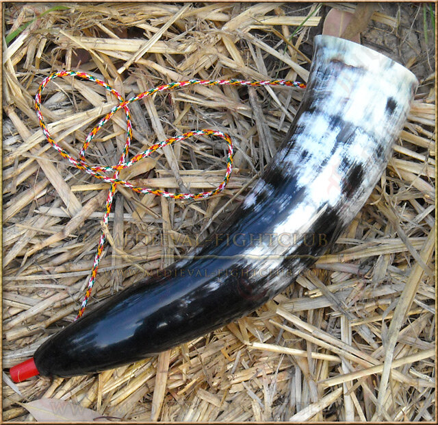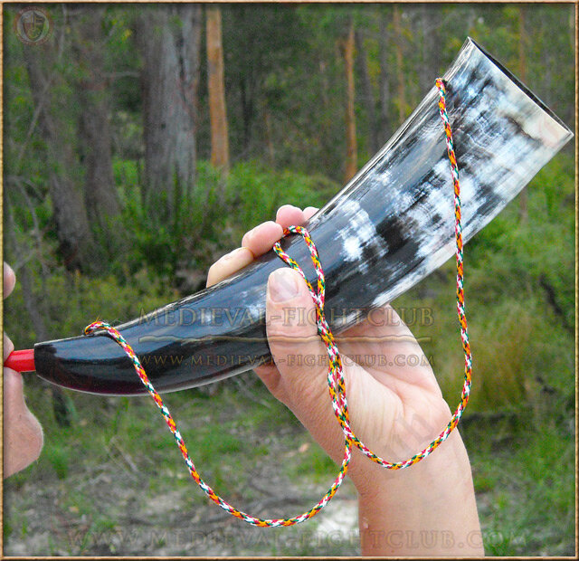 A blowing horn can be used for battle calls over long distances as the shape creates a natural amplification for sound. Like modern trumpets the sound is made from the pressure and rapid vibration of lips.