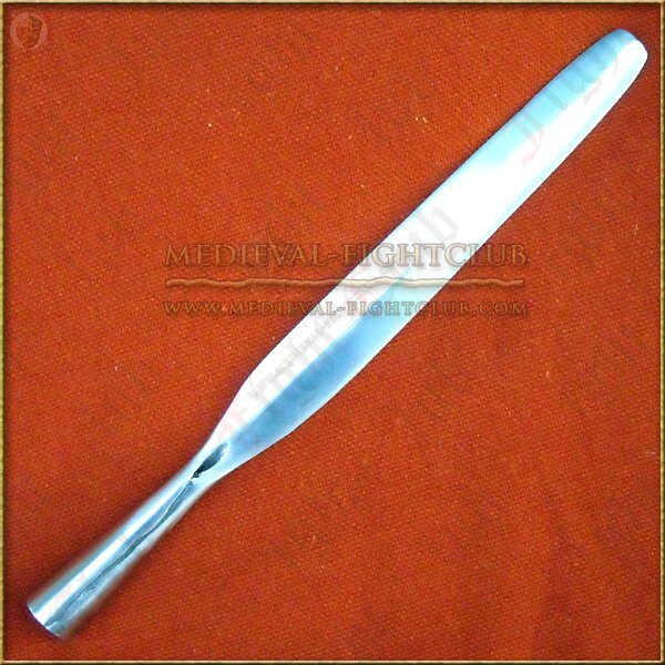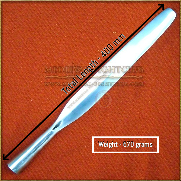 This hand forged spear has a very safe tip with a large surface area (100 square millimetres) making it safer than just rounding off a standard spear. Approximately 25mm round. Spear head designed for re-enactors and hand forged from one piece.