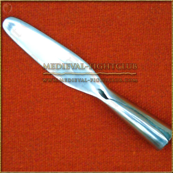 Spear or Javelin head designed for re-enactors and hand forged from one piece. This small lightweight spear has a very safe 20mm tip which is purpose designed to comply with most re-enactment combat standards. These features make it perfect re-enacment choice for combat of single handed spear and shield.