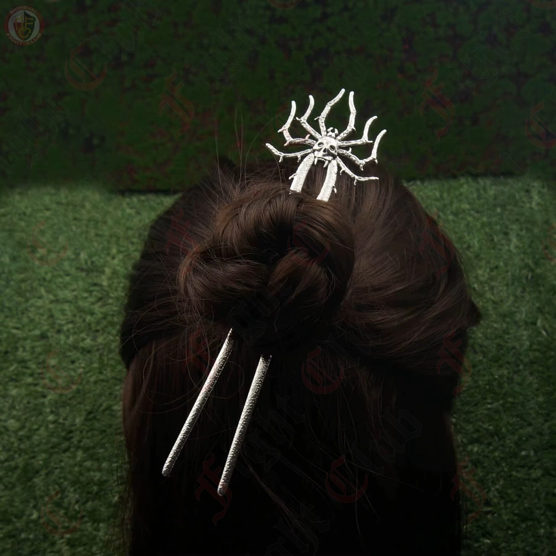 This hair pin depicts a spider whose abdomen is a skull and whose fangs make the pin.