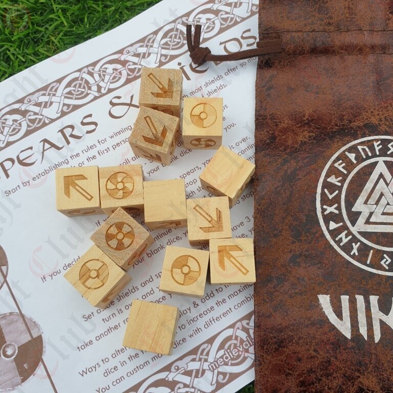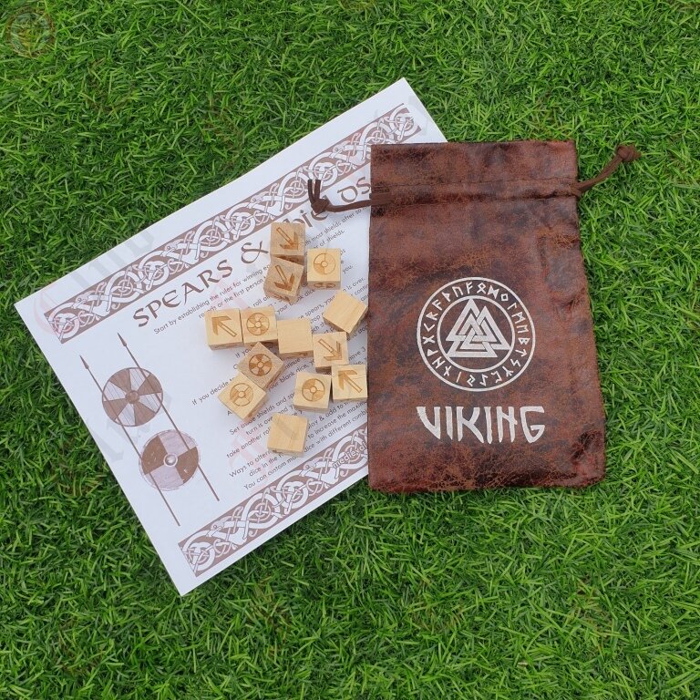 A game set includes a small pouch,13 Viking dice & suggested game rules in English and a version using Viking words.The use of Viking words in the context of a game can be a useful educational tool.