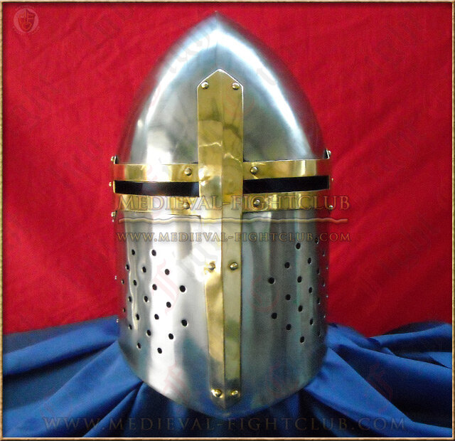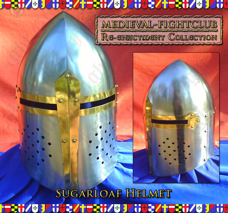 The Sugarloaf Helmet is a full face helmet that is a cross helmet between the heaume and the bascinet where the skull of the helmet was pointed like a bascinet, and the sides enclosed like a heaume. The tall, pointed top offered a much better glancing surface than the older flat-tops, allowing blows from a sword, mace or axe to be harmlessly deflected.