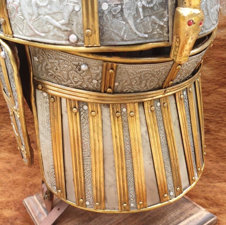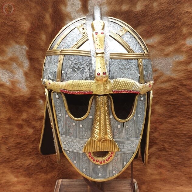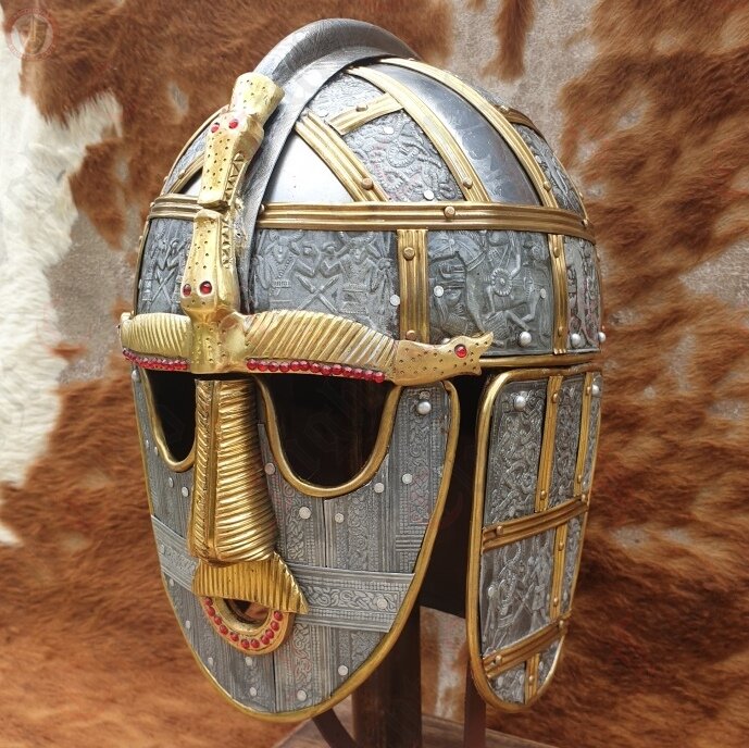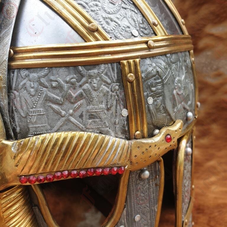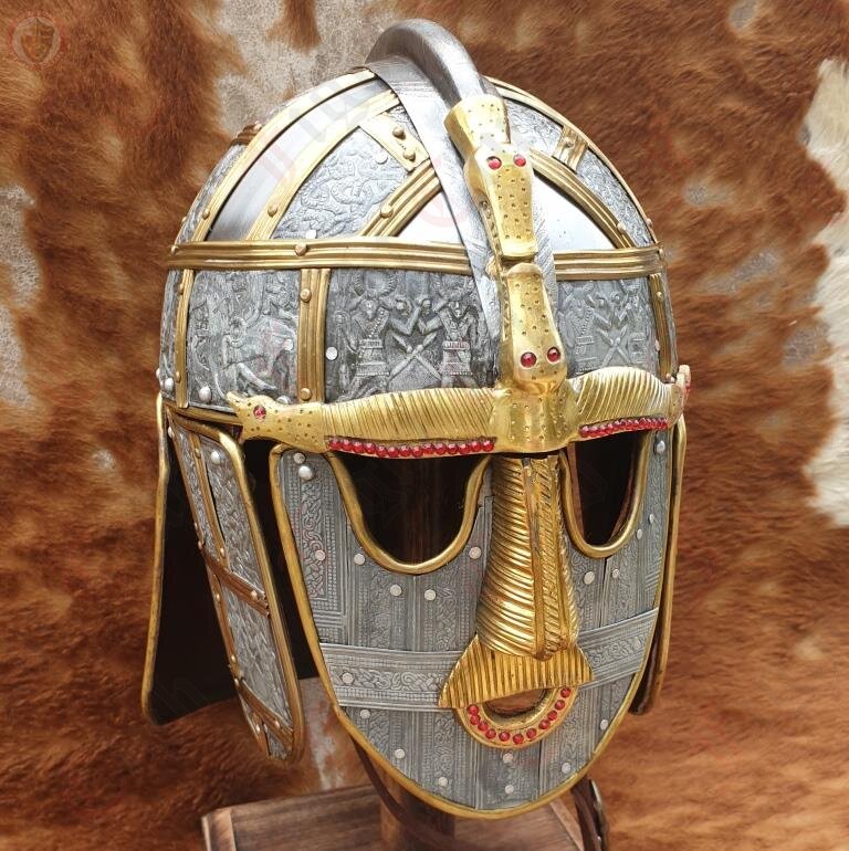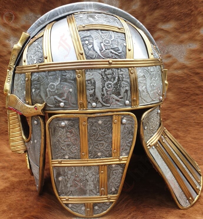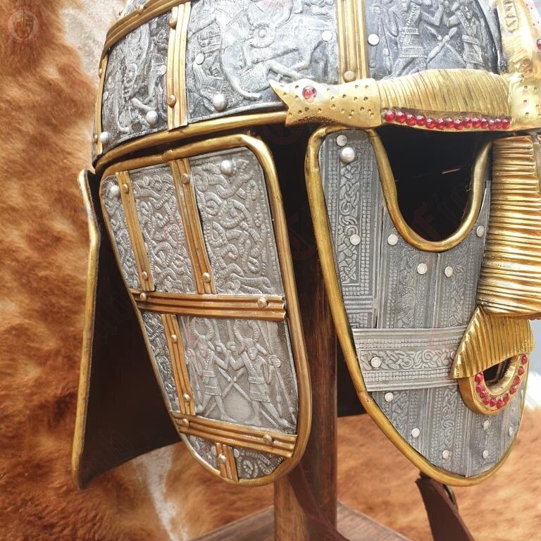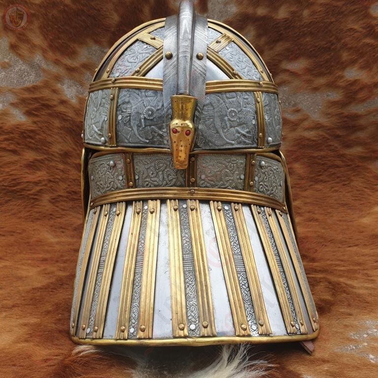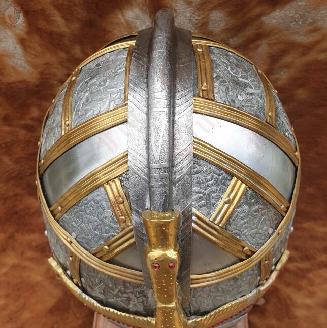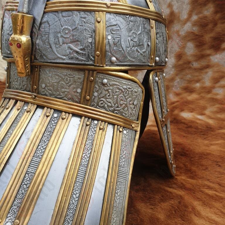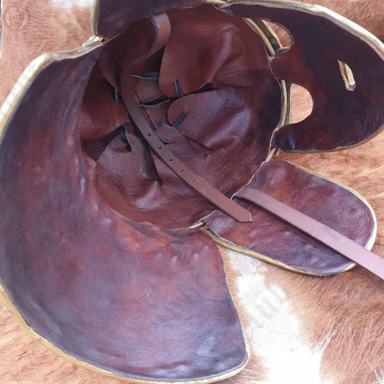 This replica comes with a decorative etching on the panels and brass highlights of the helmet, with leather lining and chin strap.