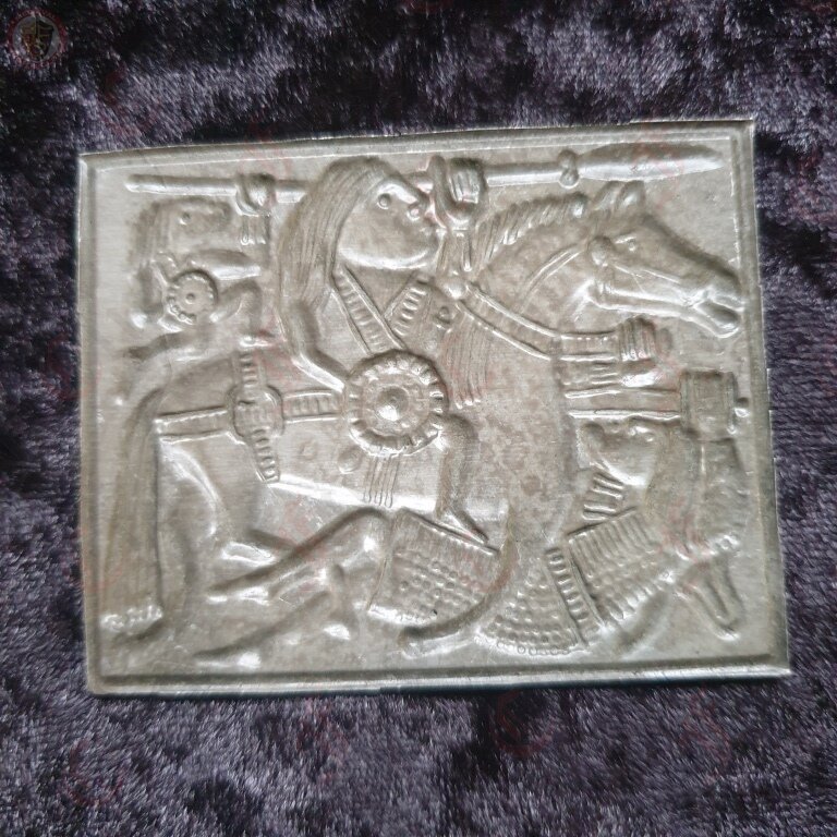 This is a plate reconstruction from the Sutton Hoo helmet. This decorated Anglo-Saxon helmet was discovered during the 1939 excavation of the Sutton Hoo ship-burial. Buried around 625 AD. It is believed to have been the helmet of King Raedwald.