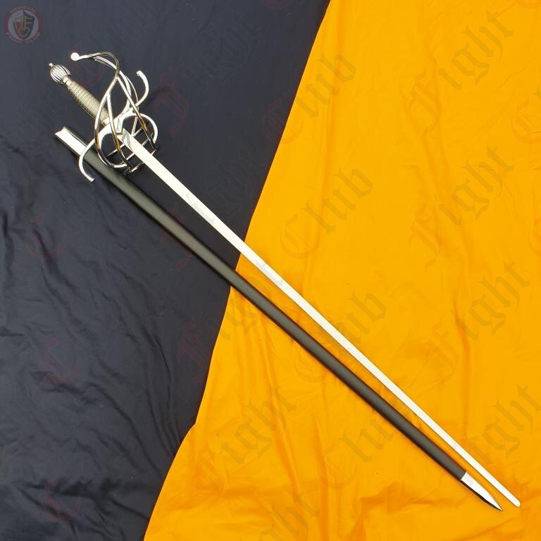 This rapier features a "swept hilt", a popular style of rapier hilt from Italy. The swirls and bars make a sort of basket, great for protecting the hand against an opponent's blade during a clash.