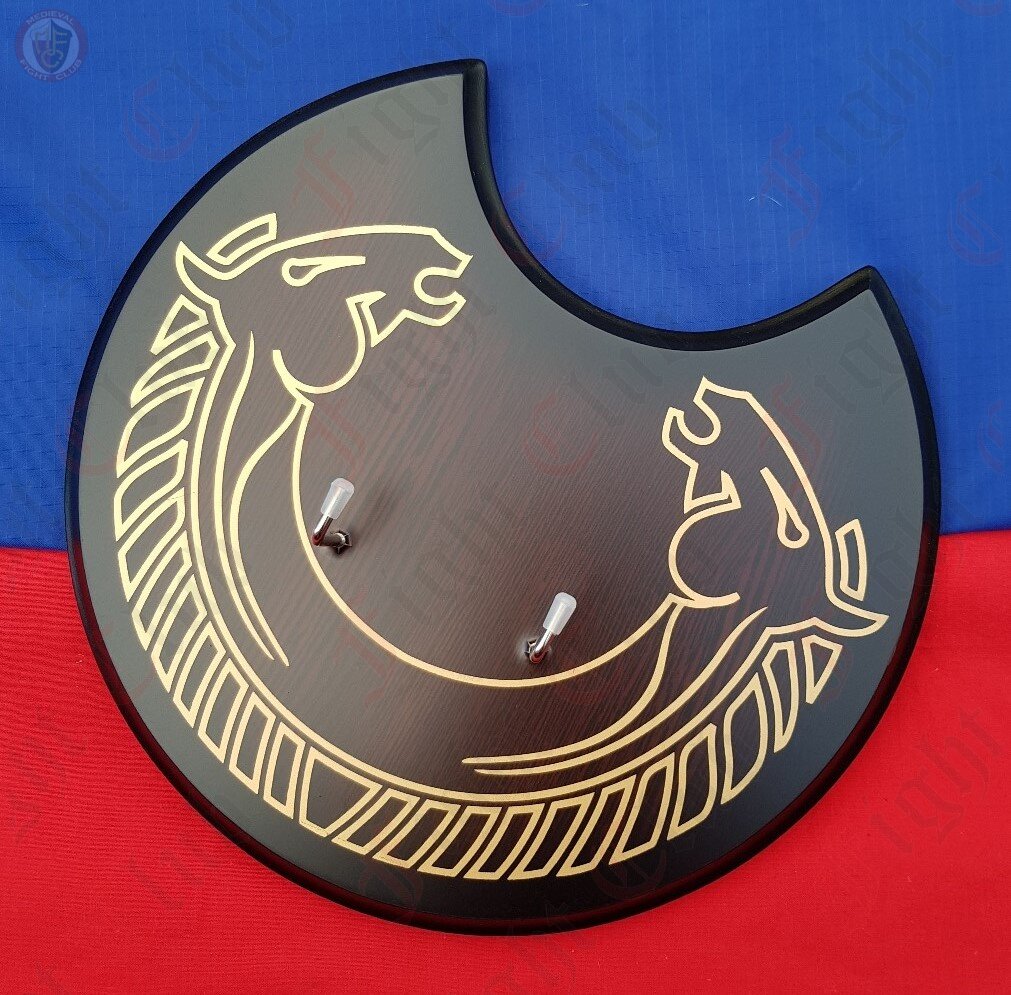 An equine inspired weapon display mount. Sick and tired of finding new ways to hang your collection? This allows you to hang your weapon on the wall away from unwanted touching but for all to see. Features the sigil of the horse lords.