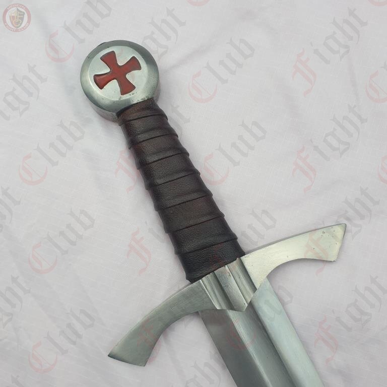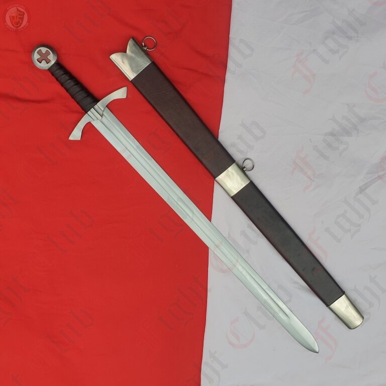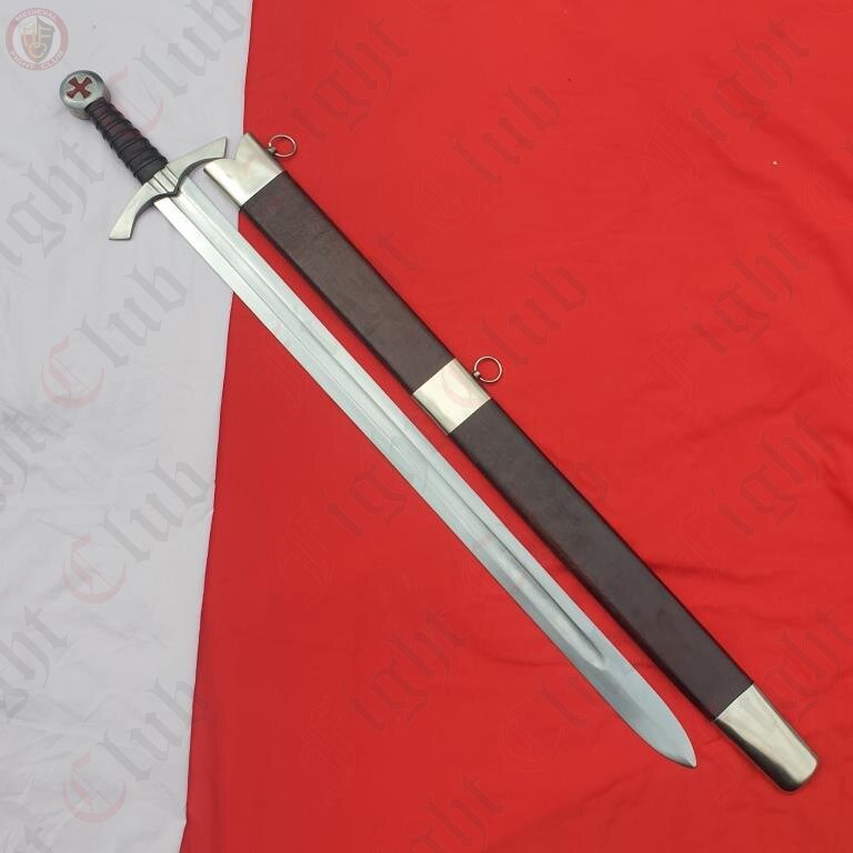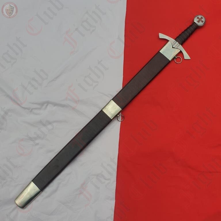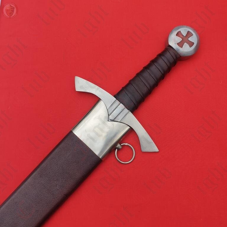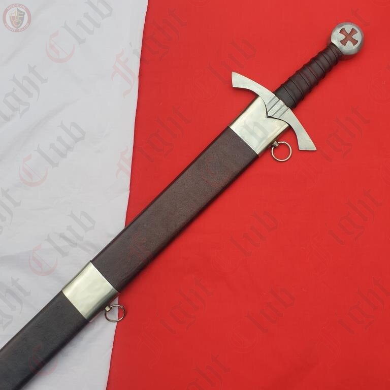 A wonderful remake of the typical arming sword used by a Templar Knight during the Crusading era. Featuring a steel blade, a wide swept crossguard and a round pommel upon which the iconic Templar Cross is enameled. A blade also comes with a wooden scabbard wrapped in black leather, equipped with a steel neck, chape and two belt hooks.