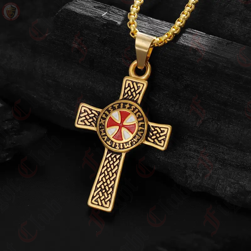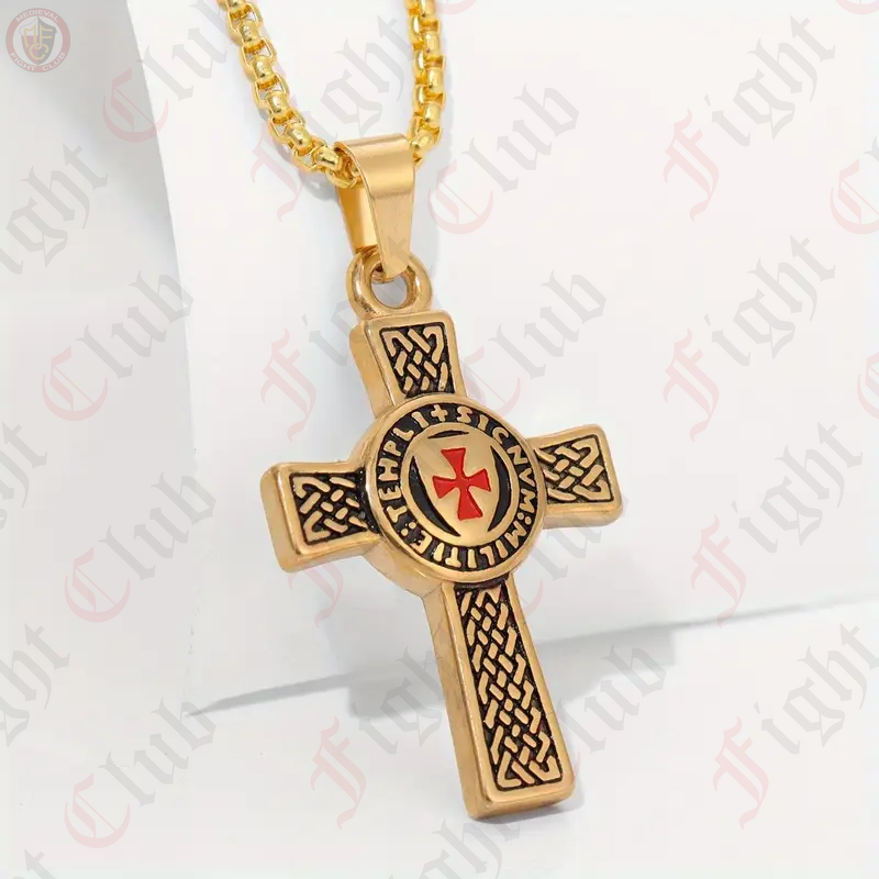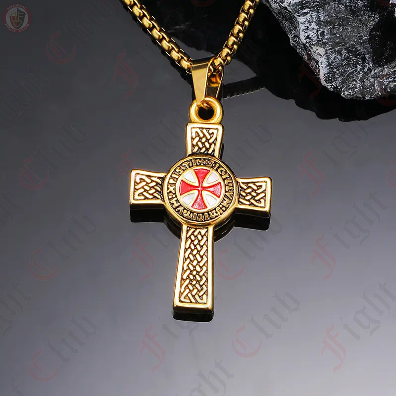 This pendant features the Templar Cross emblazoned upon the centre of a larger crucifix, showing the significance of the Templars to the wider faith. This pendant also comes with a go ldcoloured chain.