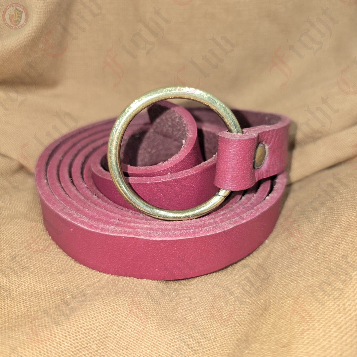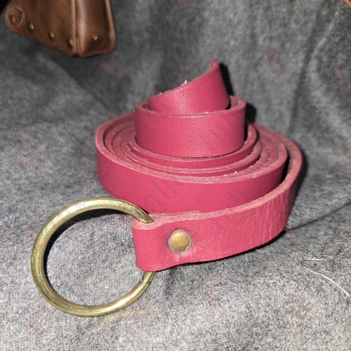 A simple, thin maroon single ring leather belt perfect for accessorising your reenactment or LARP gear.