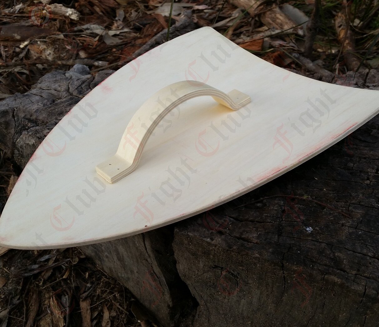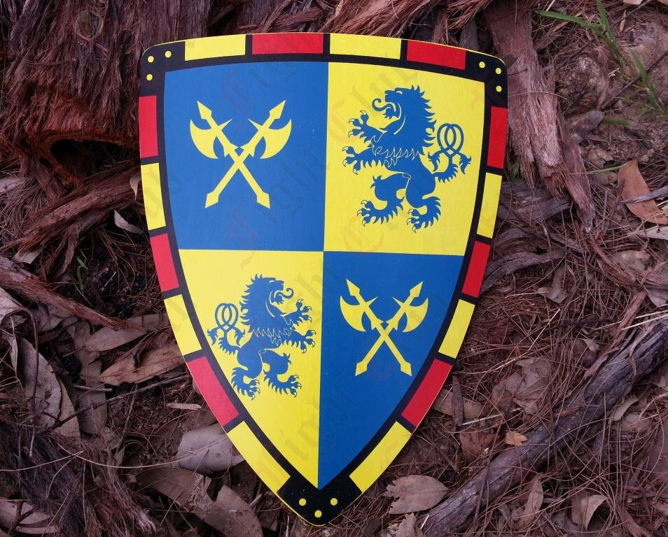 Light weight plywood curved toy shield with quartered field of blue and yellow with rampant blue lions and yellow crossed axes.