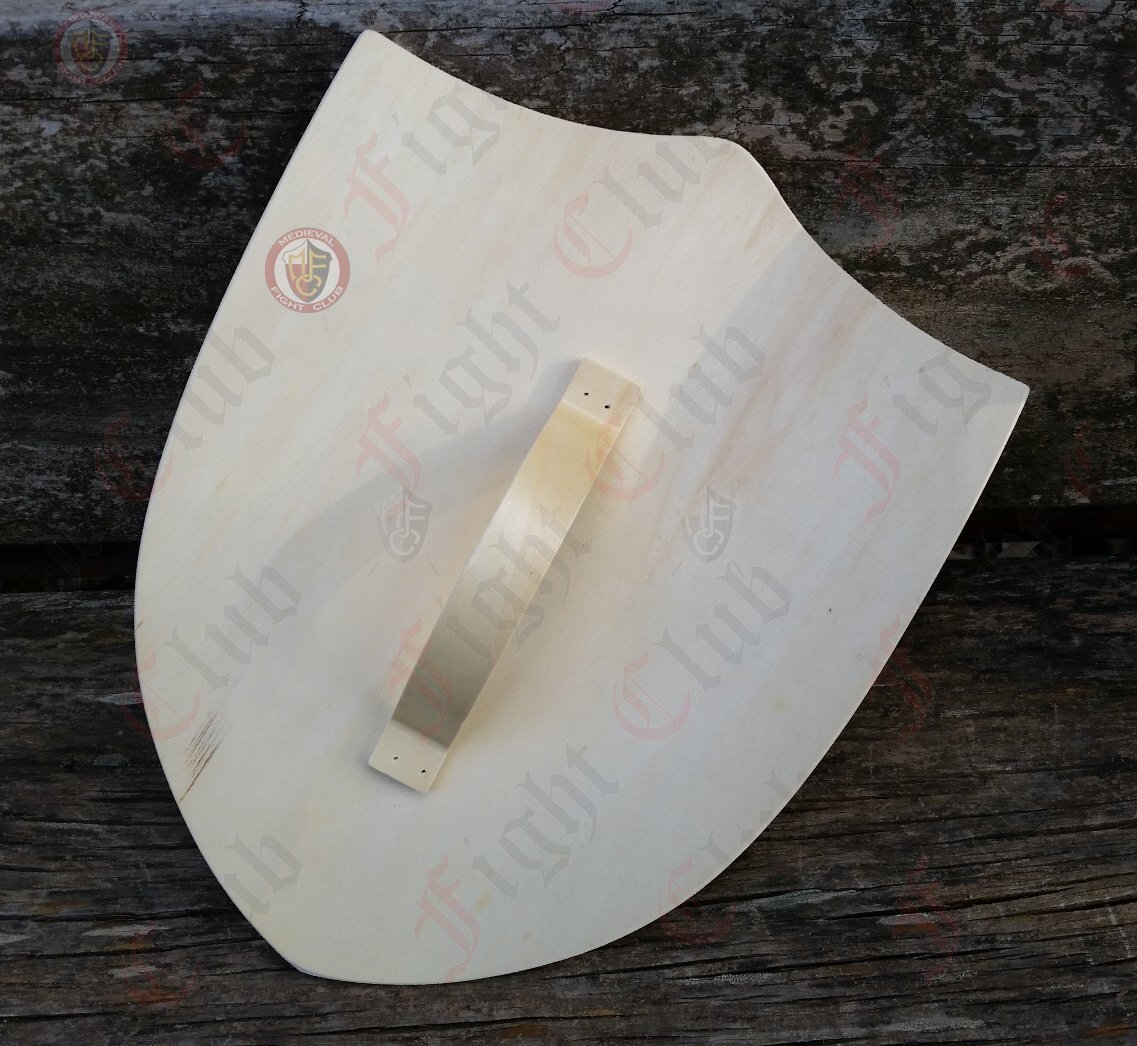 Light weight plywood curved toy shield with stylised dragon inset on green within a yellow field