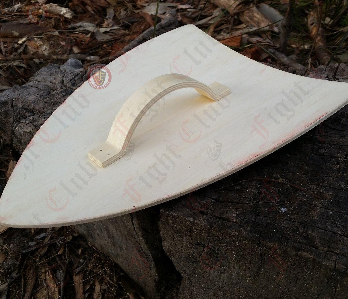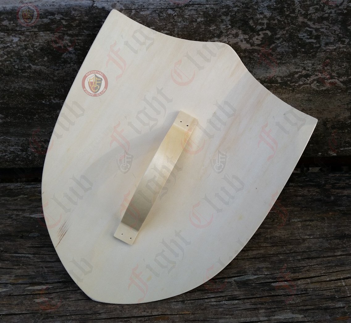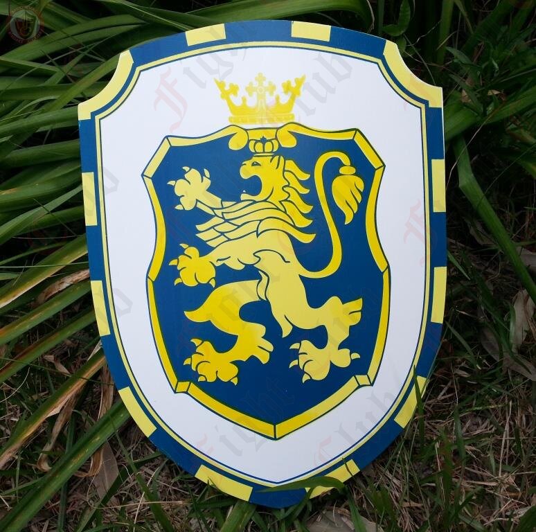 Light weight plywood curved toy shield with yellow lion on blue background.