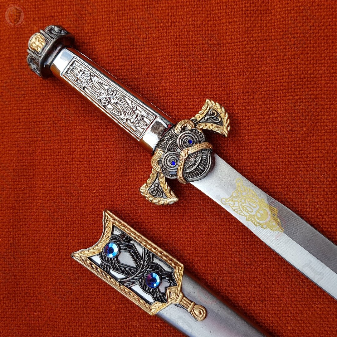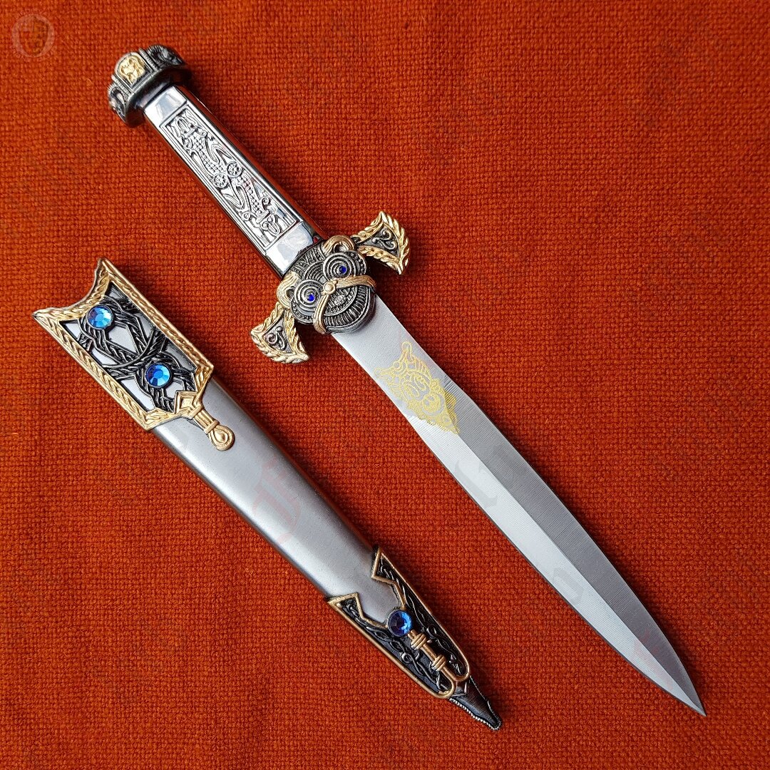 DISCONTINUED - With faux blue gem insets and golden detailing, this decorative dagger with scabbard is a beautiful addition to any collection.