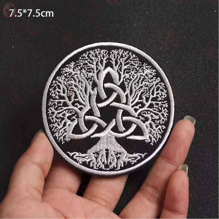 Surrounding the central symbol, finely embroidered branches spread outward in a circular form, while the roots anchor the design below, creating a sense of harmony between earth and sky. The crisp white stitching stands out boldly against the black background, giving the patch a clean, high-contrast look that is both eye-catching and timeless.