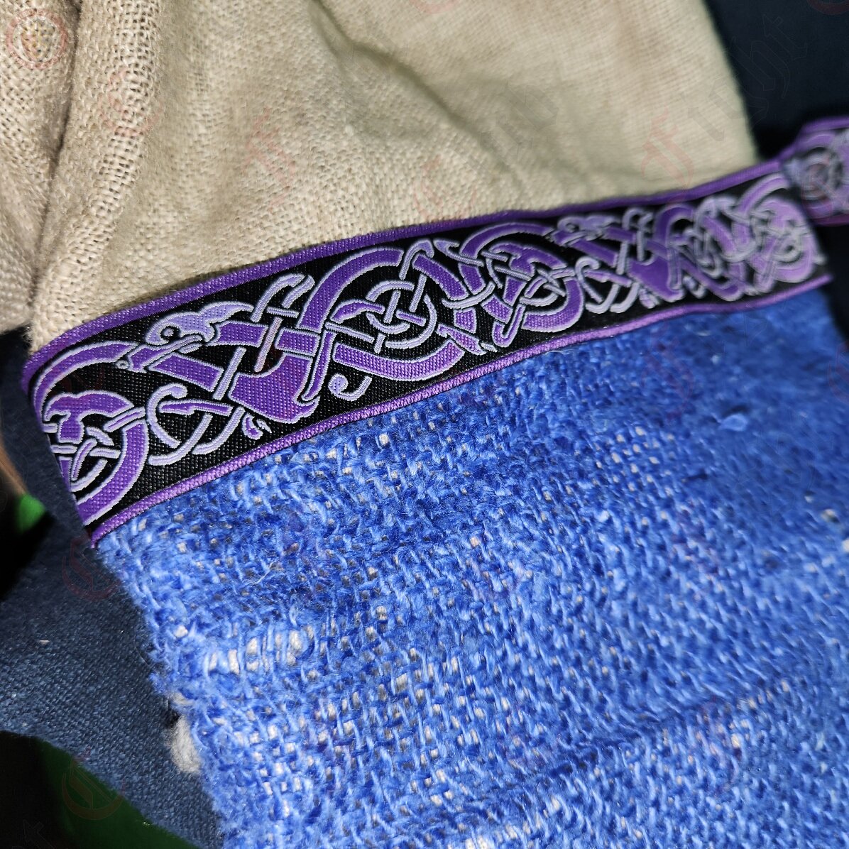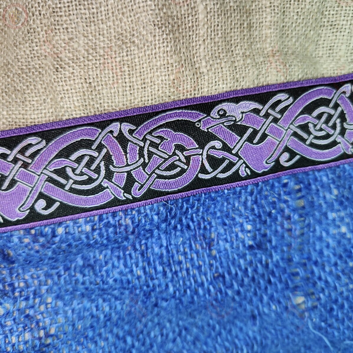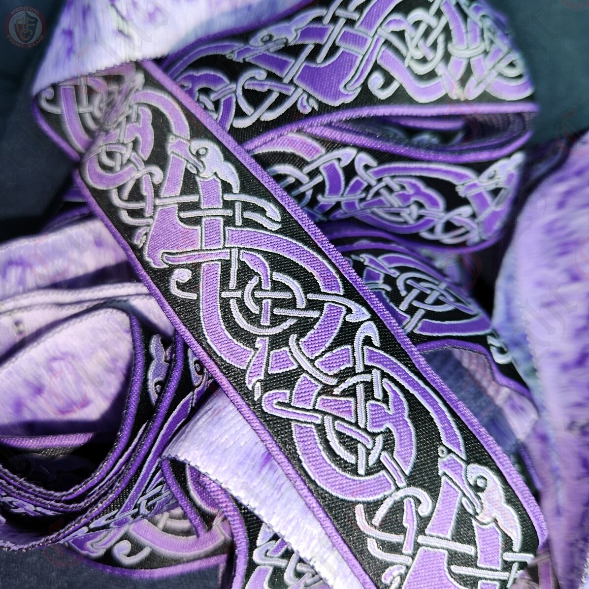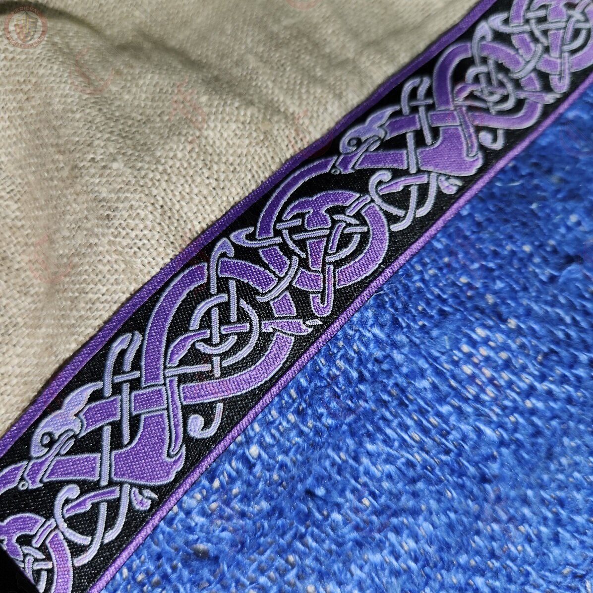 Woven braid with a Norse dog design in an endless pattern. In shades of purple and black. Suitable for Viking costume and tunics.