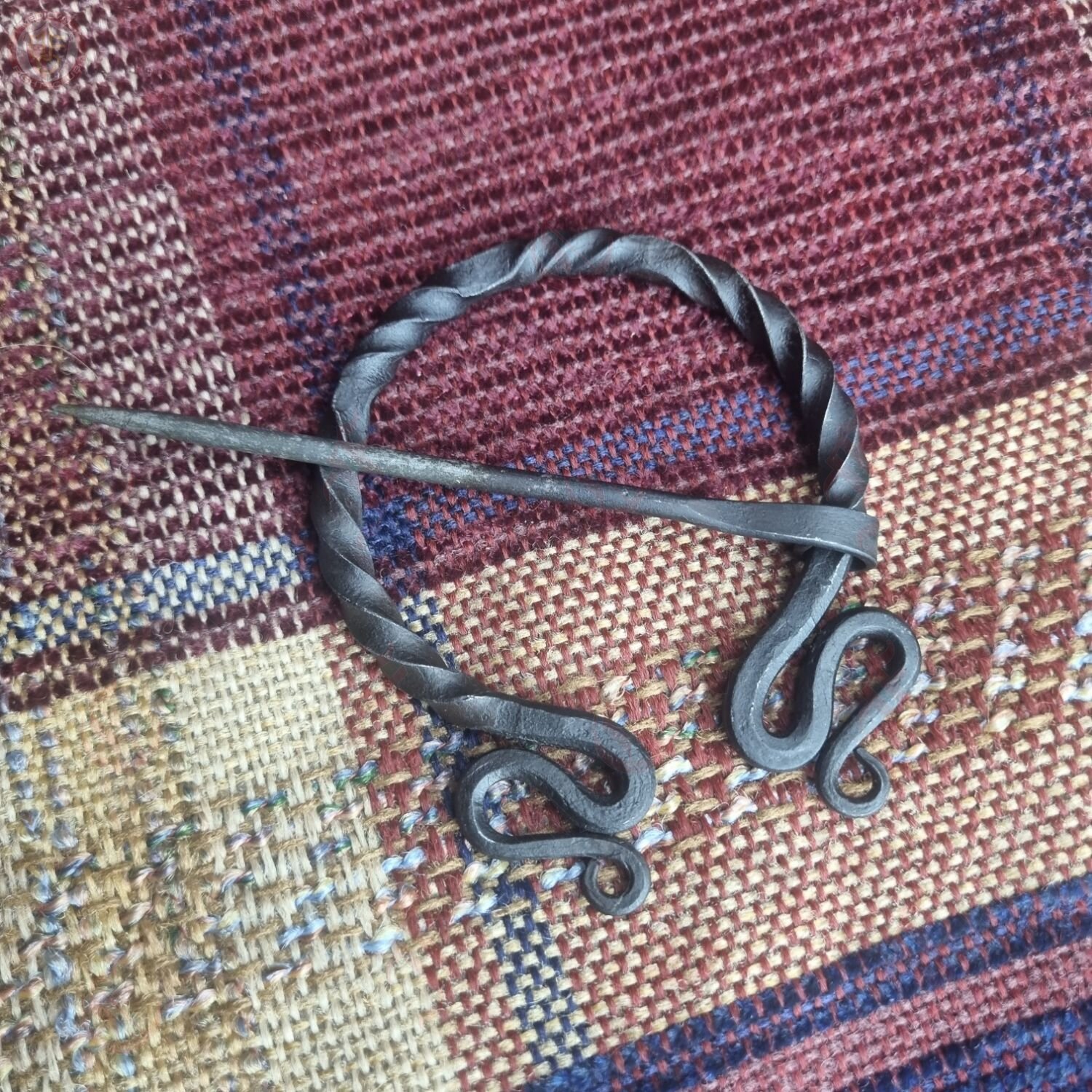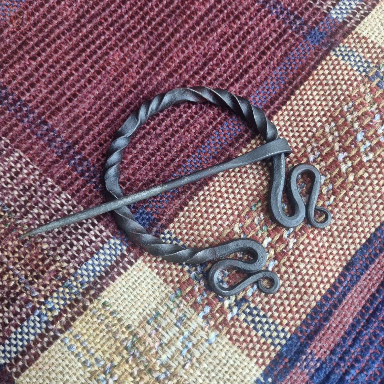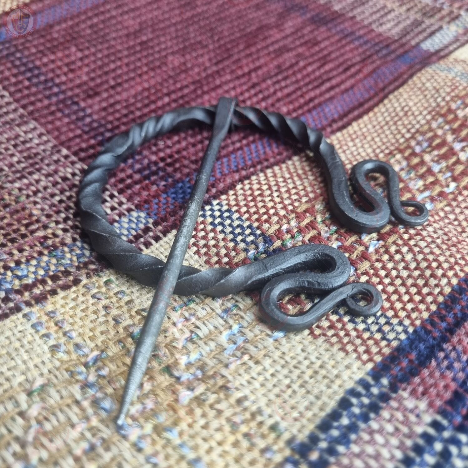 A penannular cloak pin with a wrought iron twist running its entire circumference, before ending with detailed triple curl design.