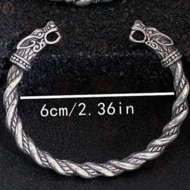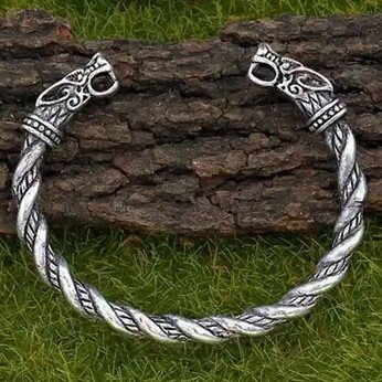 This Viking torc wristband displays wolves styled to resemble intricately carved wolves. Silver in colour, this torc is made of a metal but unlike many torcs it does not flex. Perfect for the esteemed Viking warrior.