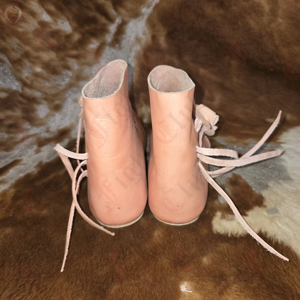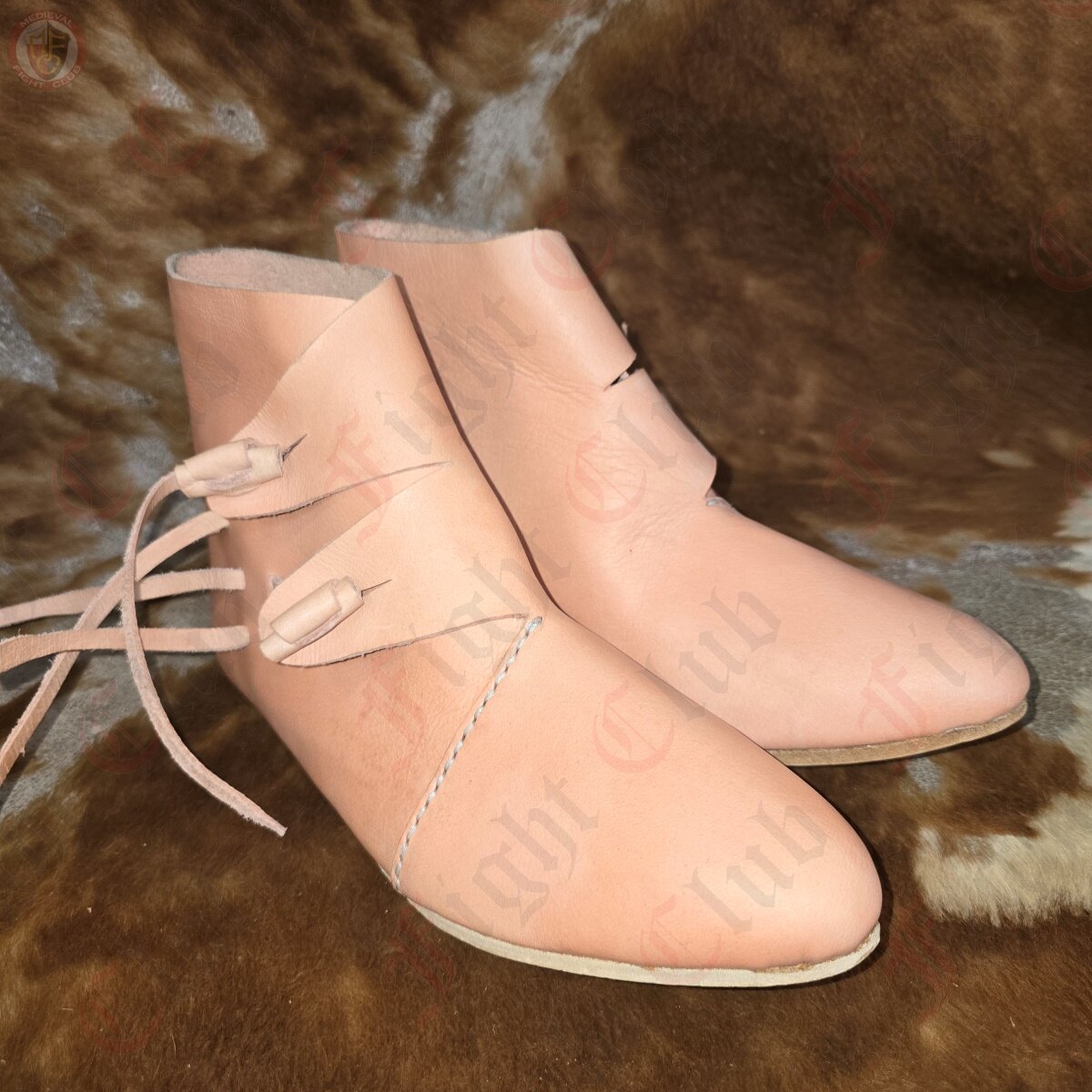 These boots are based on archeological findings made in York, aged between the 9th and 10th centuries. The toggles on the side are made entirely of leather and are on long straps allowing for easy tightening and loosening.