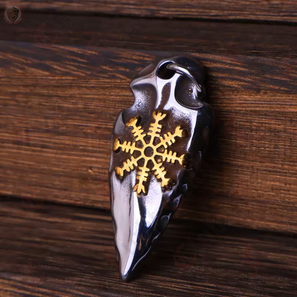 This pendant depicts ancient arrowheads with a vegvisir on the front