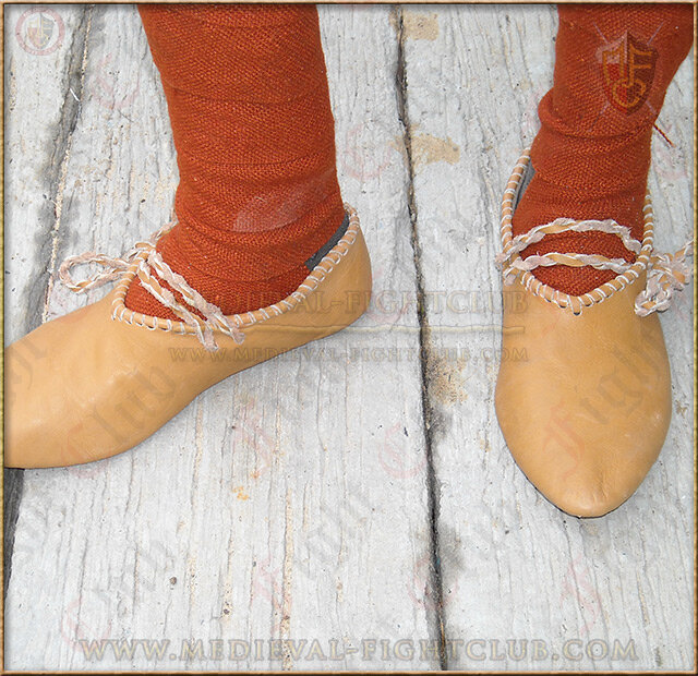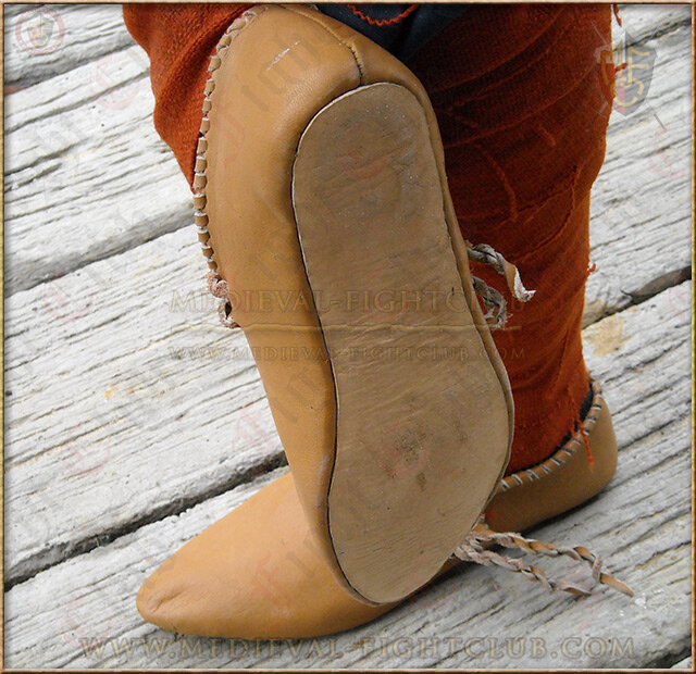 Handcrafted leather shoes made by the turn-shoe method using correct period style tunnel stitching. The sole and upper were joined together inside out, and then turned right side out. This type of shoe was usually fastened by a drawstring or lacing.