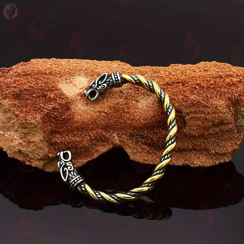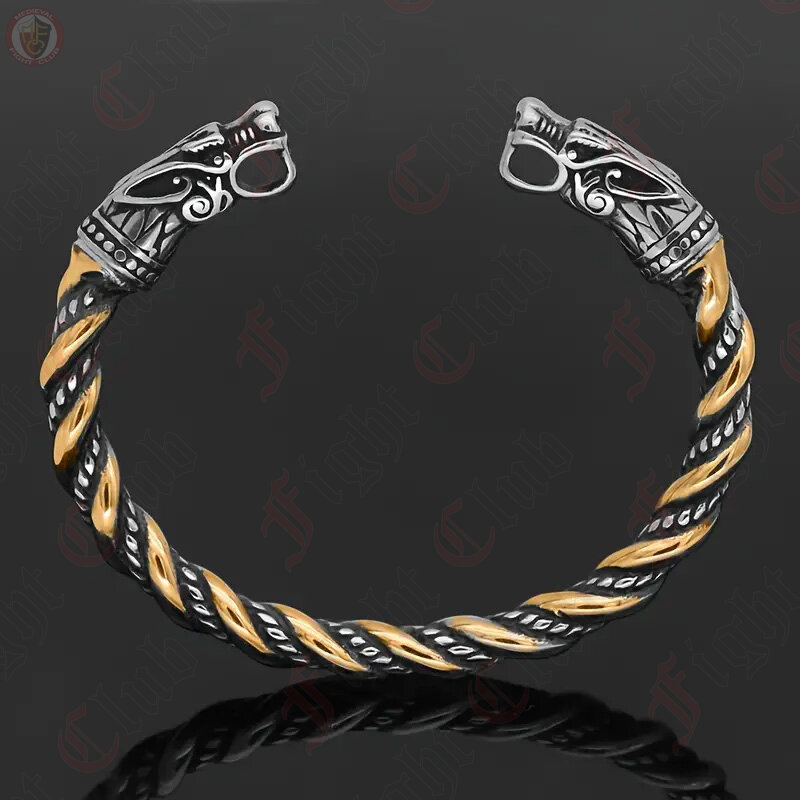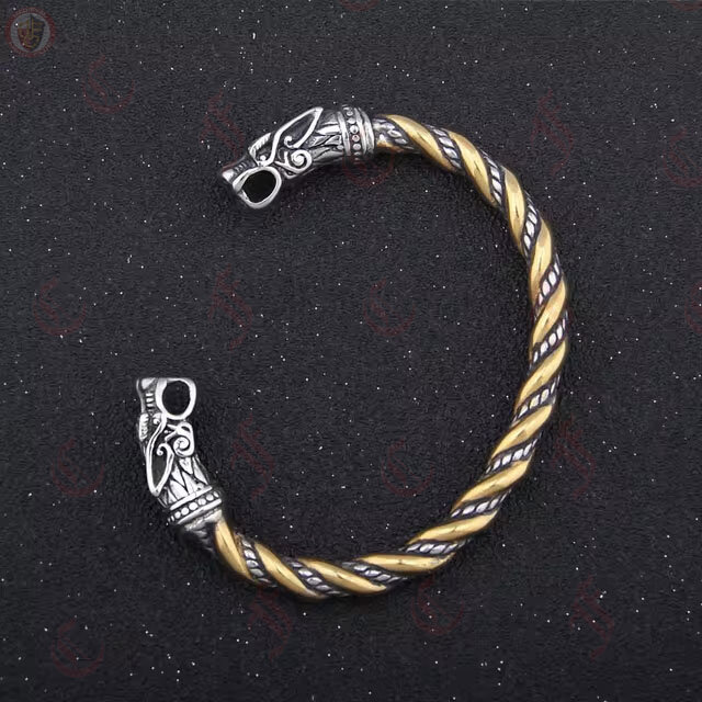 This wrist torc features a braided strand twisted with a smooth single strand adorned with bird or dragon heads at each terminal.