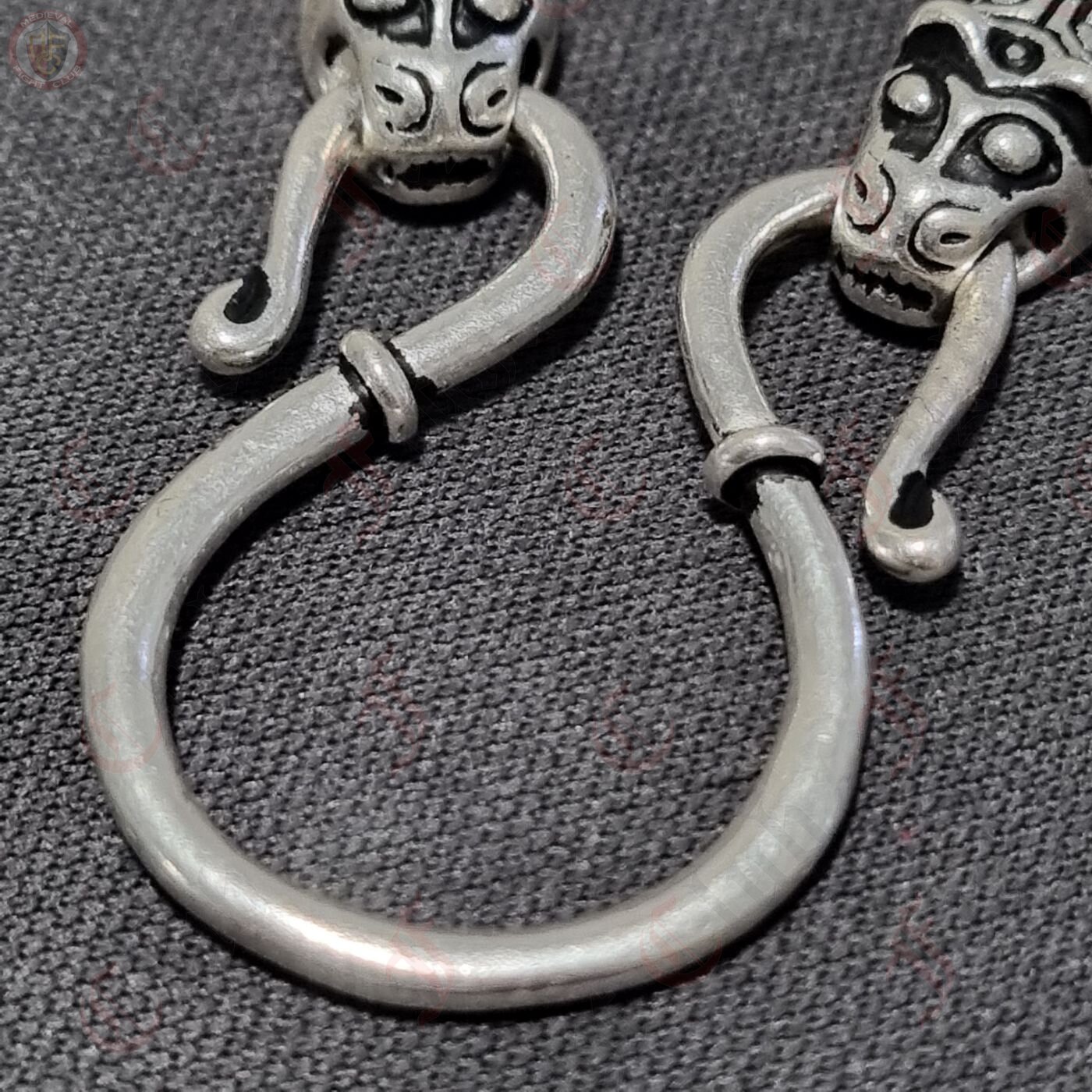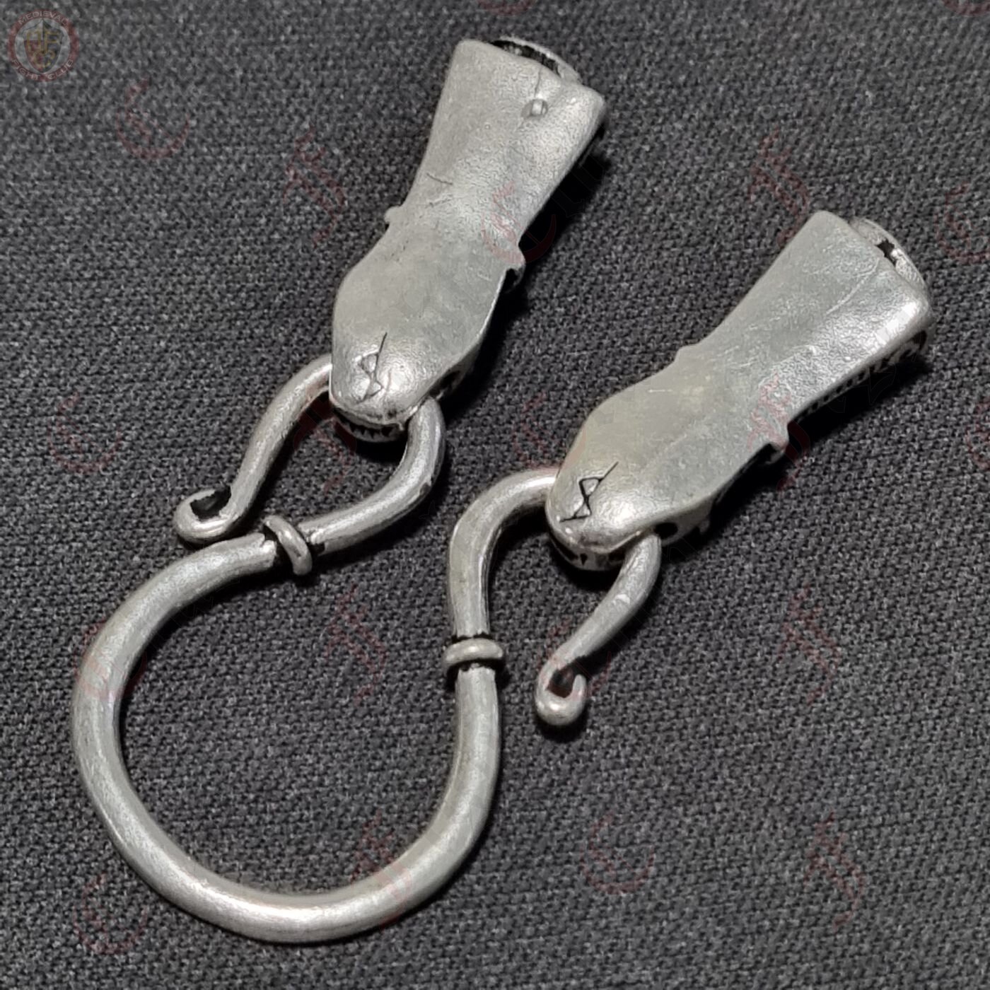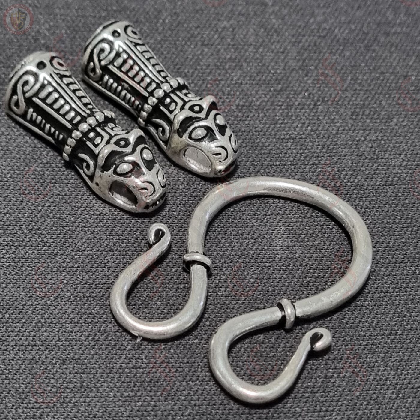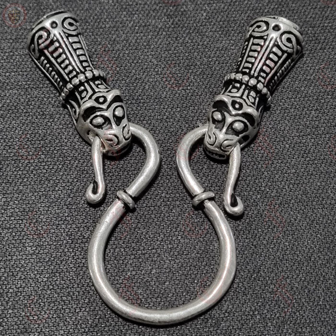 A beautifully decorated set of chain ends and omega-style hook, perfect for hanging pendants and necklaces in an authentic Viking jewellery fashion. The chain end caps are in the shape of a Viking animal head, created according to the Viking treasure horde from Mandermark on the isle Møn / Dänemark, and can be used as a decorative cap to connect two ends of a chain or cord. The omega hook is a common and stylish way of either connecting two cords or chains or for hanging charms and pendants, as shown with this set.