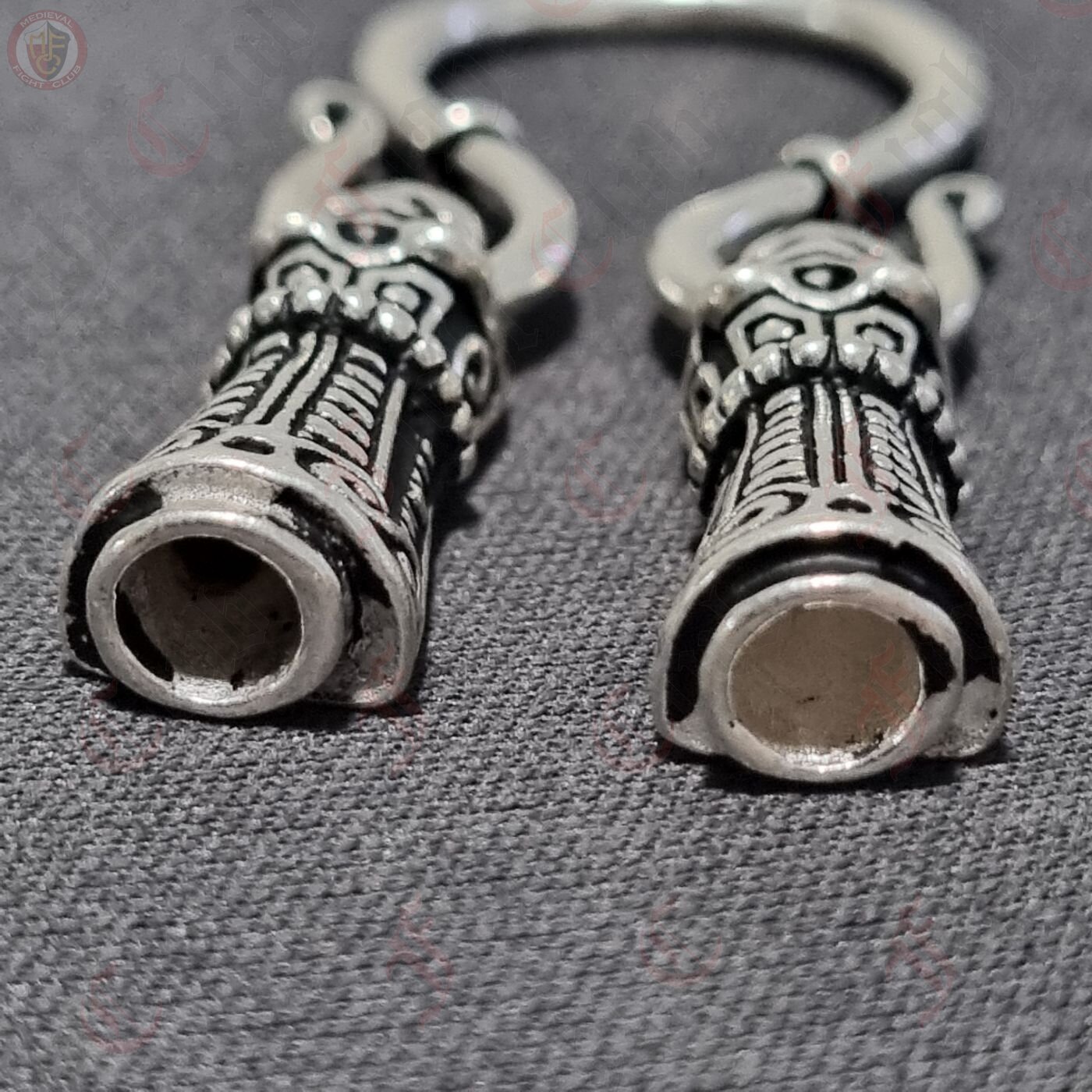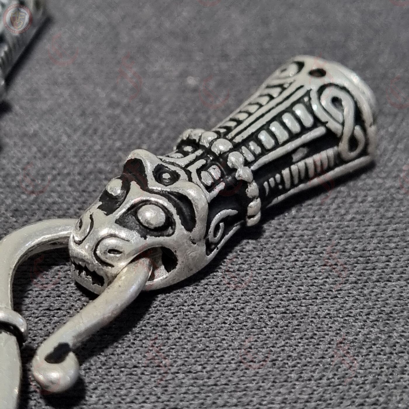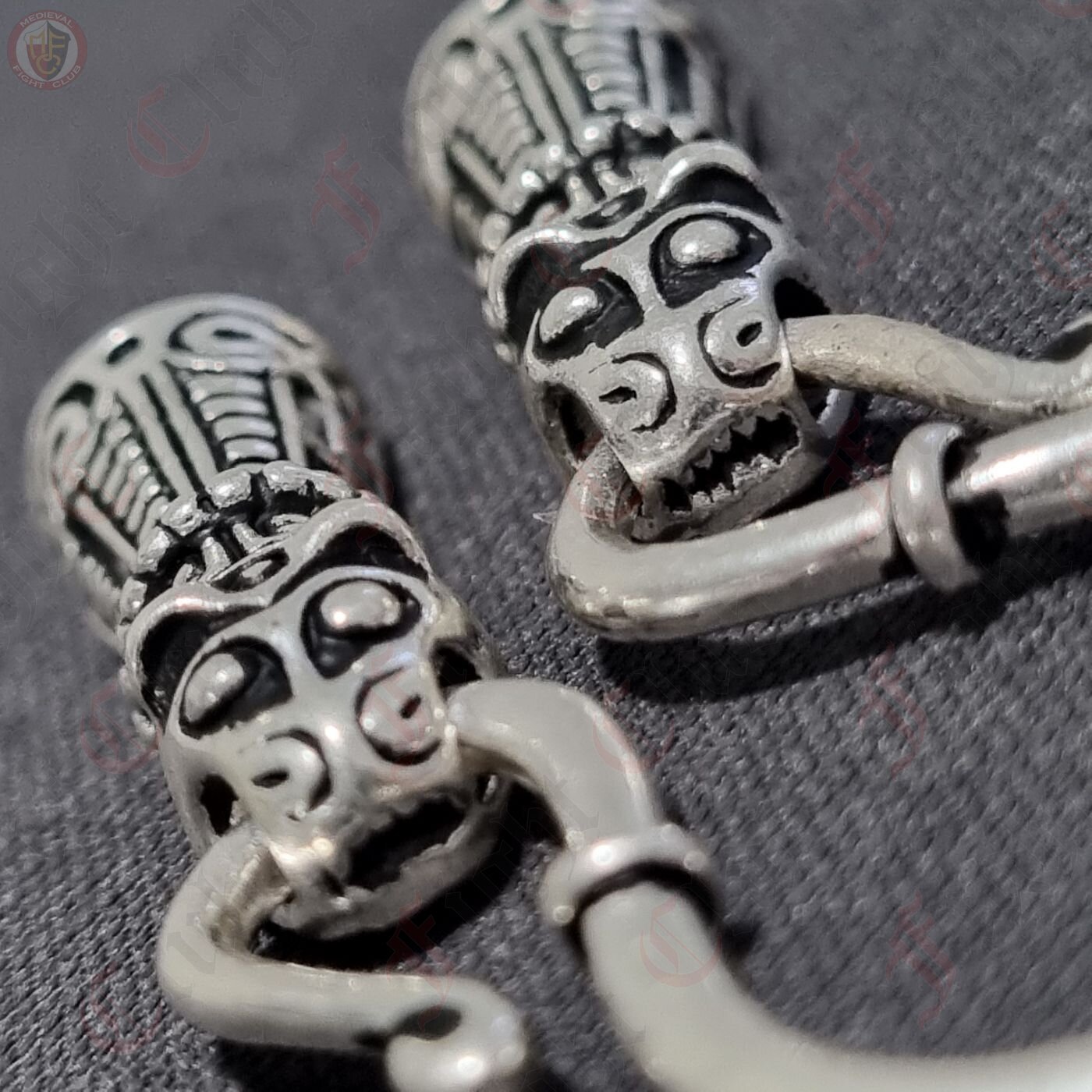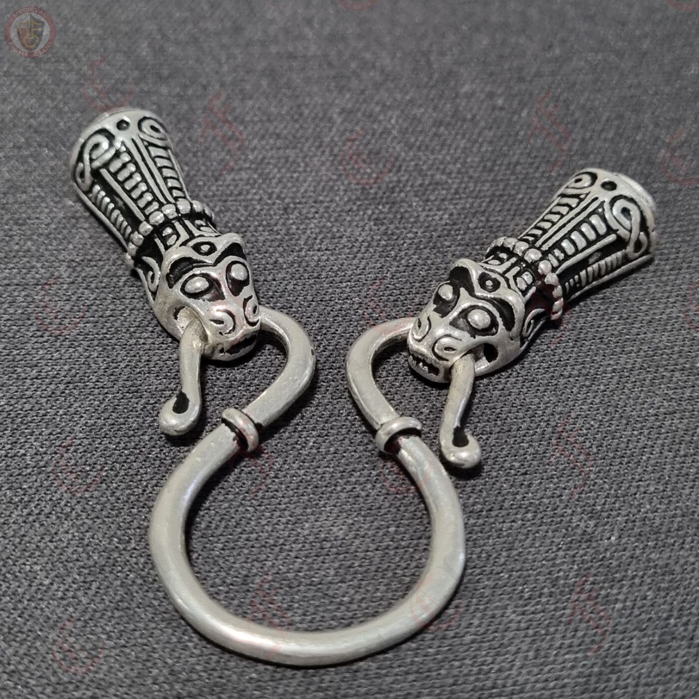 A beautifully decorated set of chain ends and omega-style hook, perfect for hanging pendants and necklaces in an authentic Viking jewellery fashion. The chain end caps are in the shape of a Viking animal head, created according to the Viking treasure horde from Mandermark on the isle Møn / Dänemark, and can be used as a decorative cap to connect two ends of a chain or cord. The omega hook is a common and stylish way of either connecting two cords or chains or for hanging charms and pendants, as shown with this set.