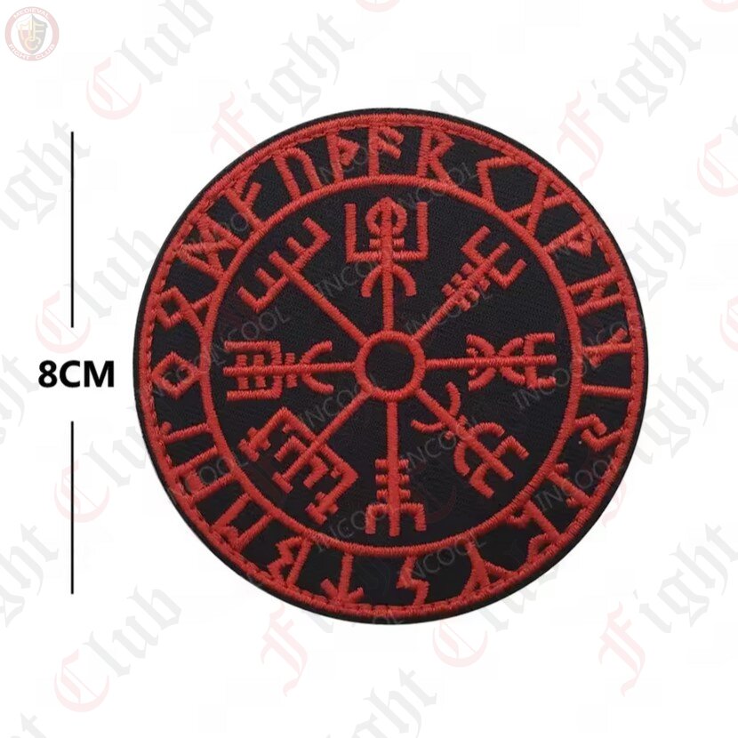 A Viking style patch. This patch is in the shape of a the Vegvisir in red with a black background.